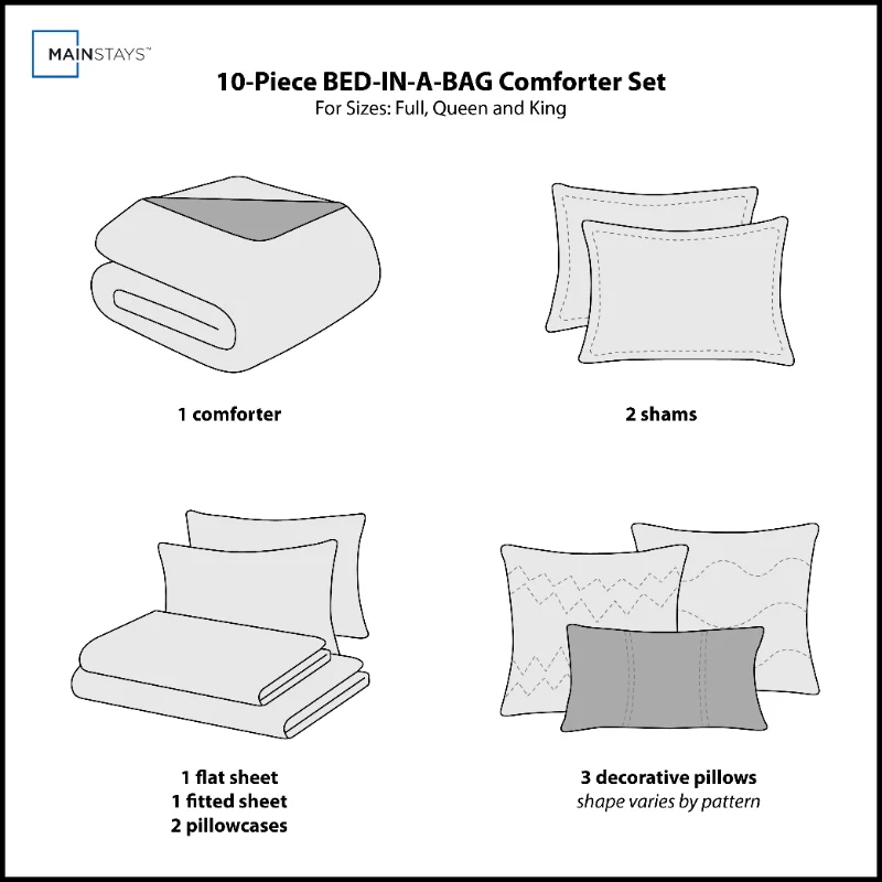 - Queen Size: 1 Comforter (88 x 92 inch), 2 Shams (20 x 26 inch + 2 inch flange), 1 Flat Sheet (90 x 102 inch), 1 Fitted Sheet (60 x 80 +13 inch), 2 Pillowcases (20 x 32 inch) and 3 decorative pillows