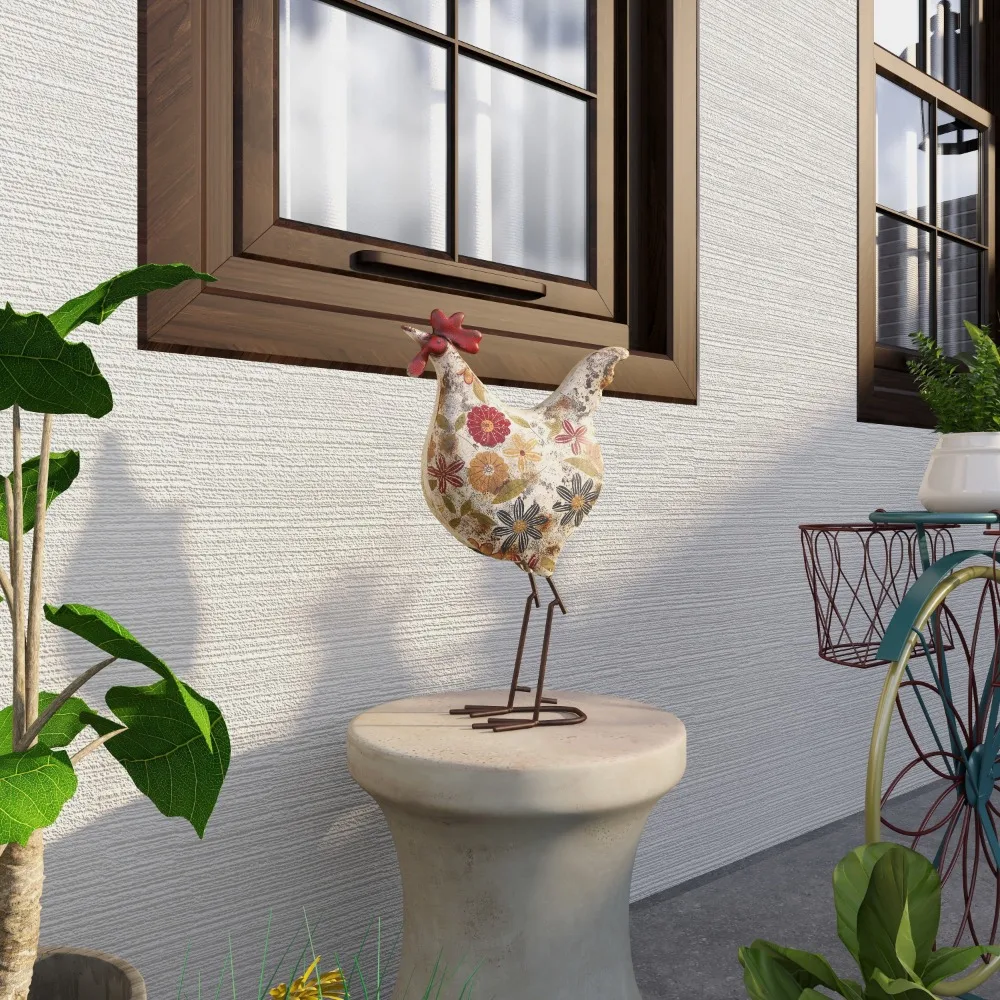 17" Indoor Outdoor Distressed Standing Rooster Garden Sculpture with U Shaped Feet is a unique addition to your stylish home. A creative way to add a welcoming look with bold design into your outdoor setting. This garden sculpture is perfect for creating a focal point and adds an inviting look to your outdoor patio space. Bring some joy and personality into your home with this adorable sculpture. This item ships in 1 carton. Iron garden sculpture makes a great gift for any occasion. Suitable for indoor and outdoor use. This item ships fully assembled in one piece. This is a single cream colored garden statue.