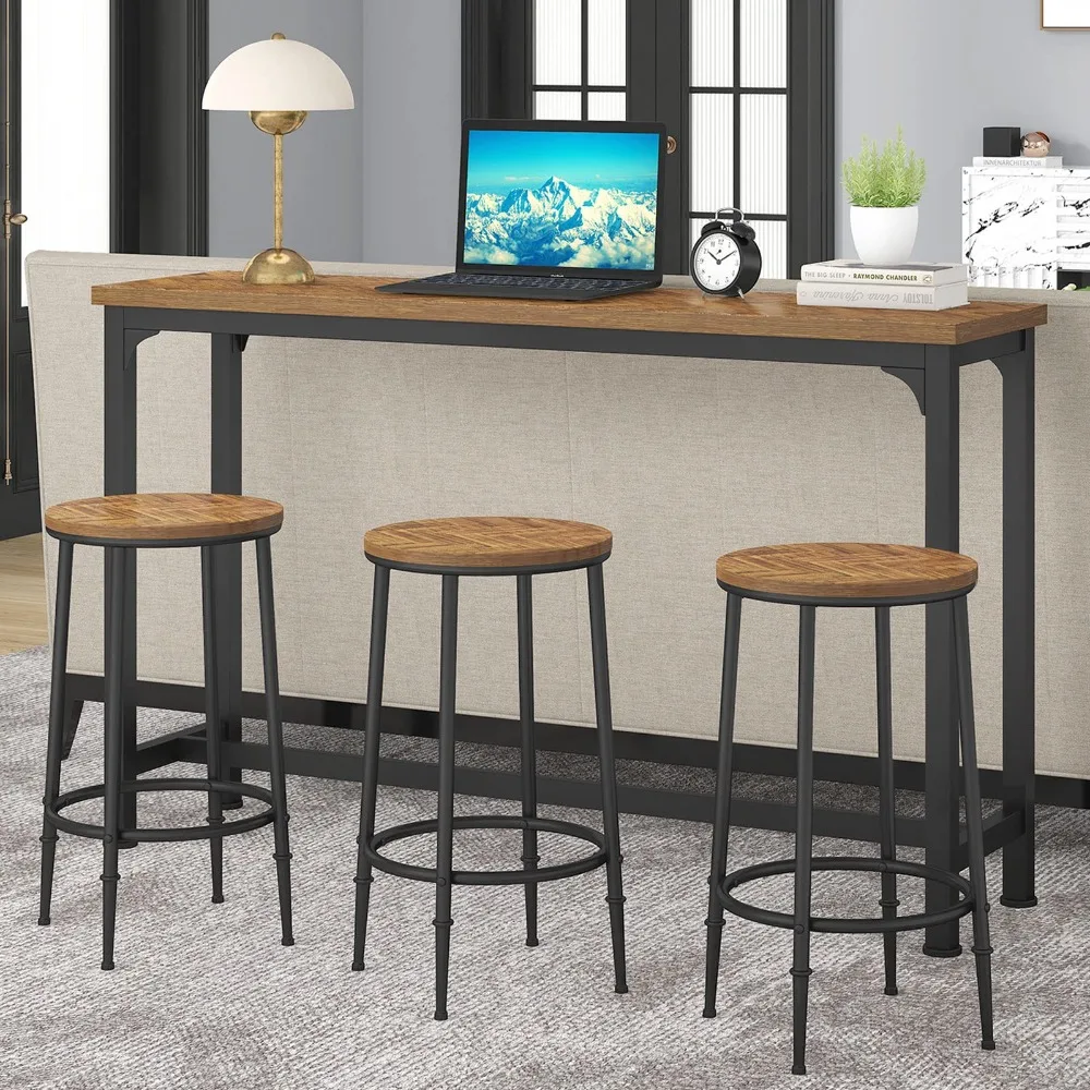 - ๐ Elevate your home decor with this stylish bar table set that doubles as a space-saving console table with stool. The stools can easily be stored underneath the table when not in use, making it a great space saver. Table size: 59" (L) x 15.4" (W) x 35.8" (H), chiars size: 16.7" (L) x 16.7" (W) x 26.4" (H)