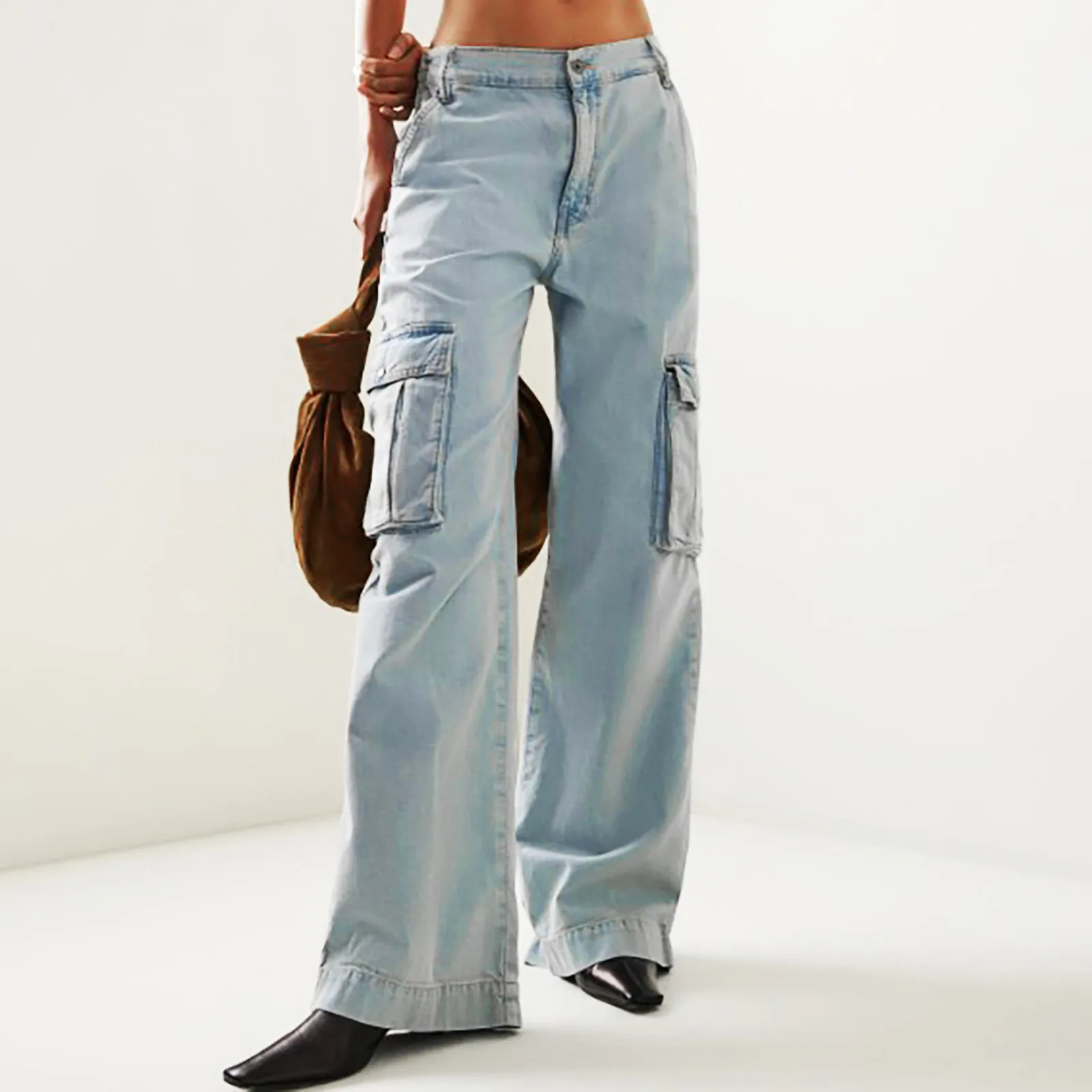 2024 Wide Leg Cargo Jeans Pants Light Blue Casual Loose