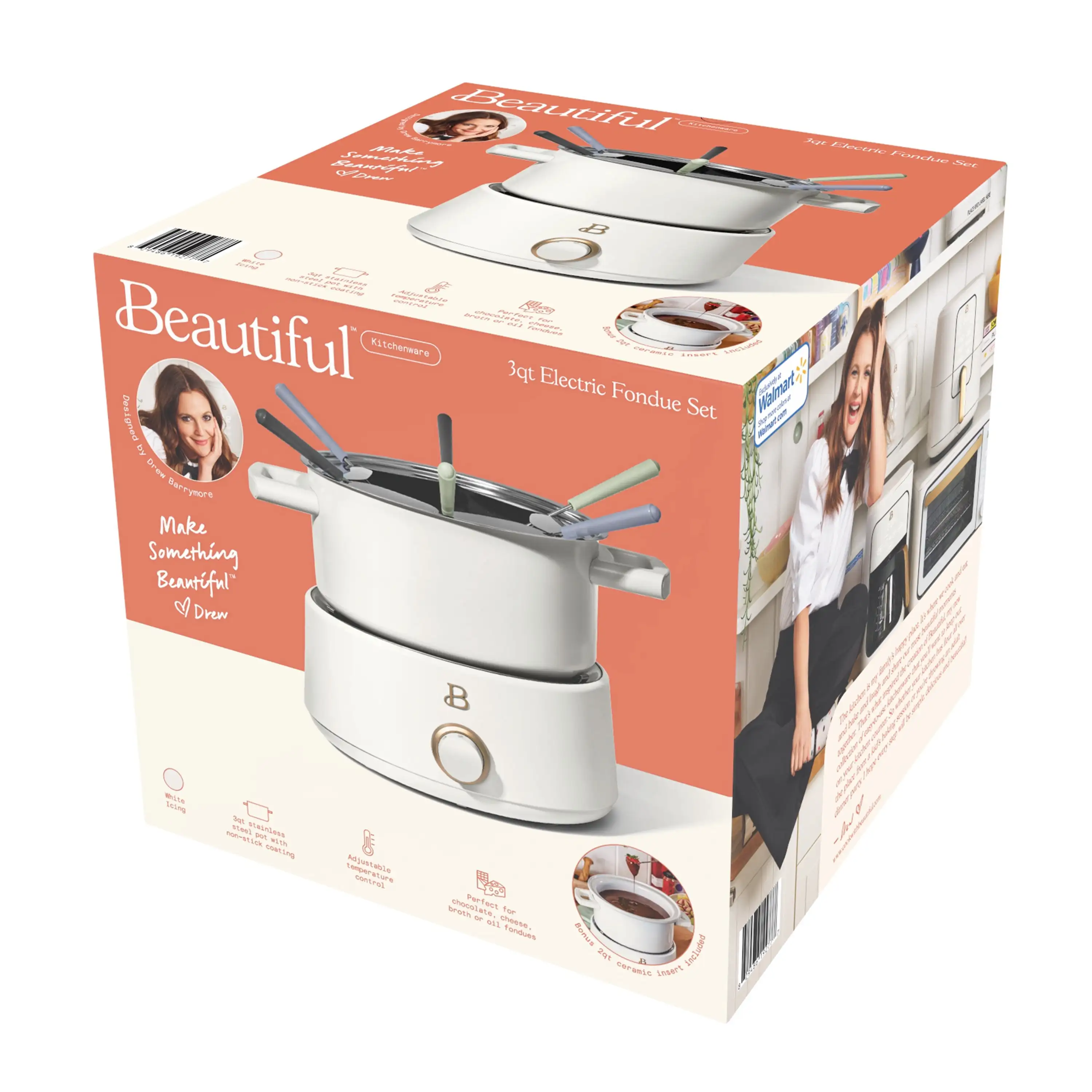 Indulge with family and friends using the Beautiful 3qt Electric Fondue Set. Enjoy perfectly melted cheese, chocolate, broth, or oil fondue with your favorite fixings. We've made melting chocolates and cheeses easy with a bonus 2qt ceramic pot. Perfect for sharing, this set comes with six colorcoded fondue forks so you know which one is yours and a stainless steel fork ring to hold them all in place. An easytouse adjustable control lets you reach justtheright temperature. Created by Drew Barrymore, Beautiful combines elegant design, contemporary colors and modern silhouettes for highperformance appliances that look beautiful on your kitchen counter.