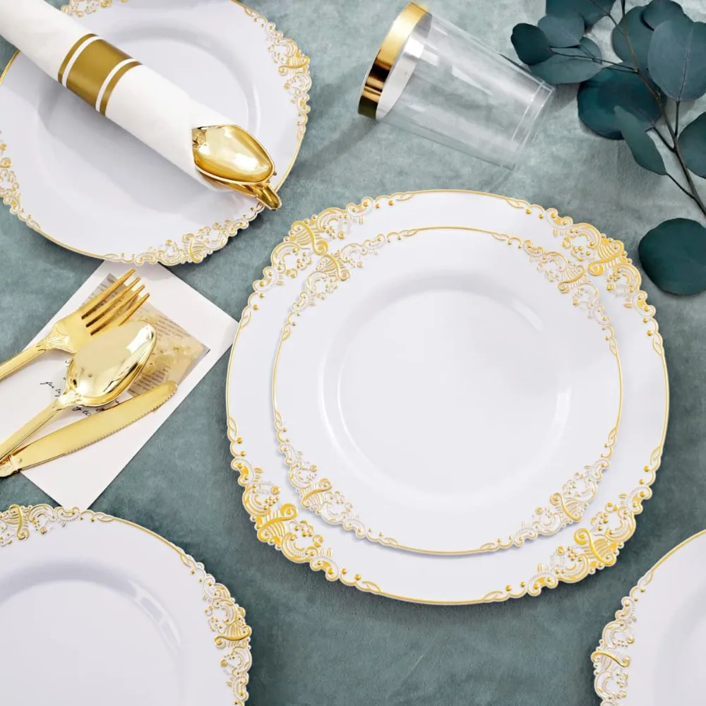 350PCS Gold Disposable Dinnerware Set for 50 Guests