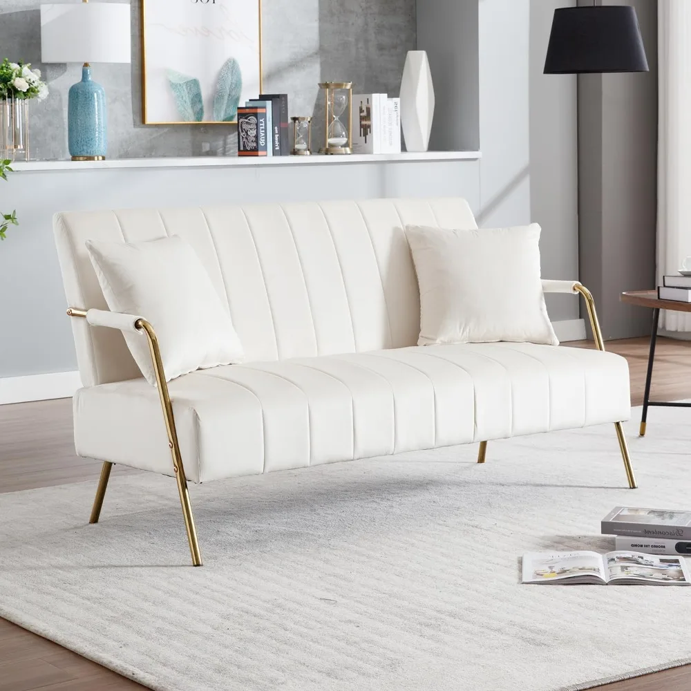 54" Upholstered Comfy Beige Velvet Couch with/Iron Legs