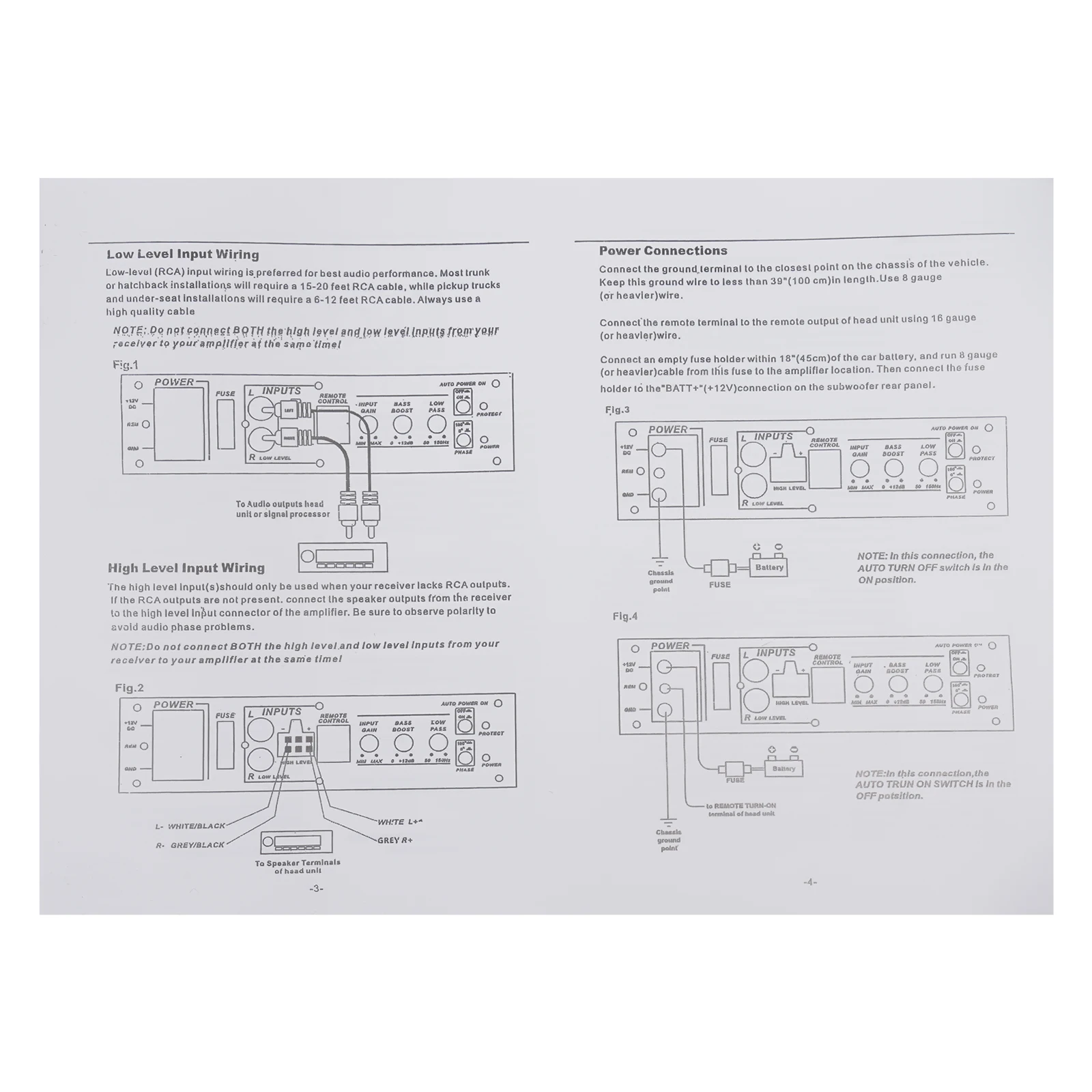 NOTE: Do not connect BOTH the high level and low level inputs from your receiver to your amplifier at the same time.