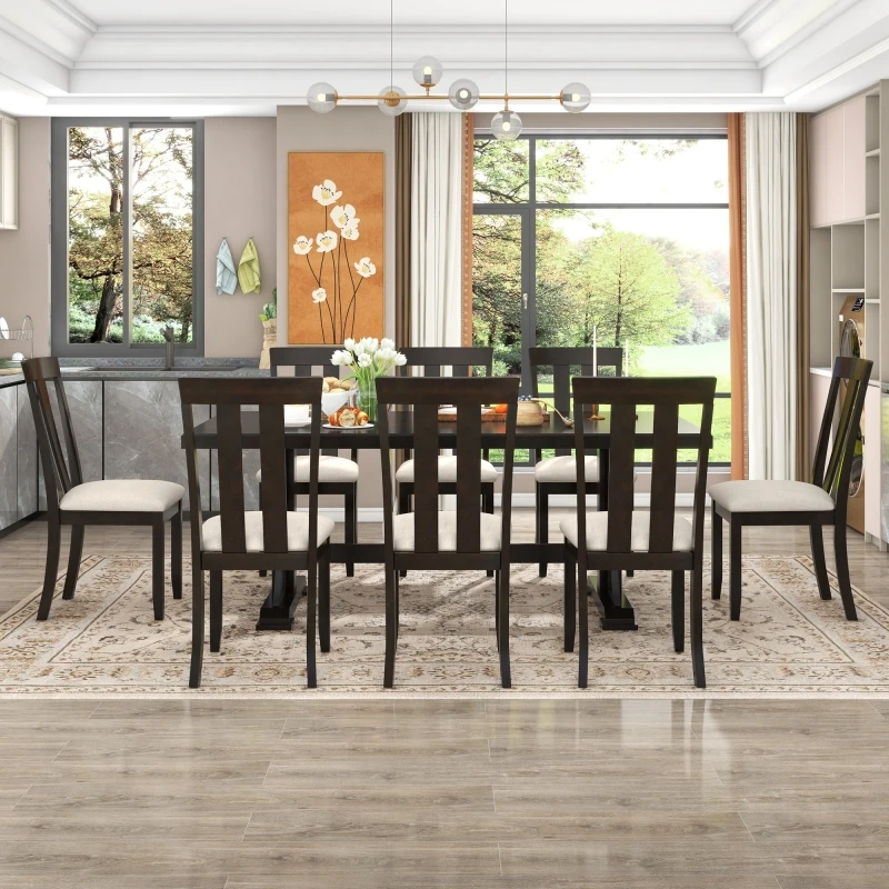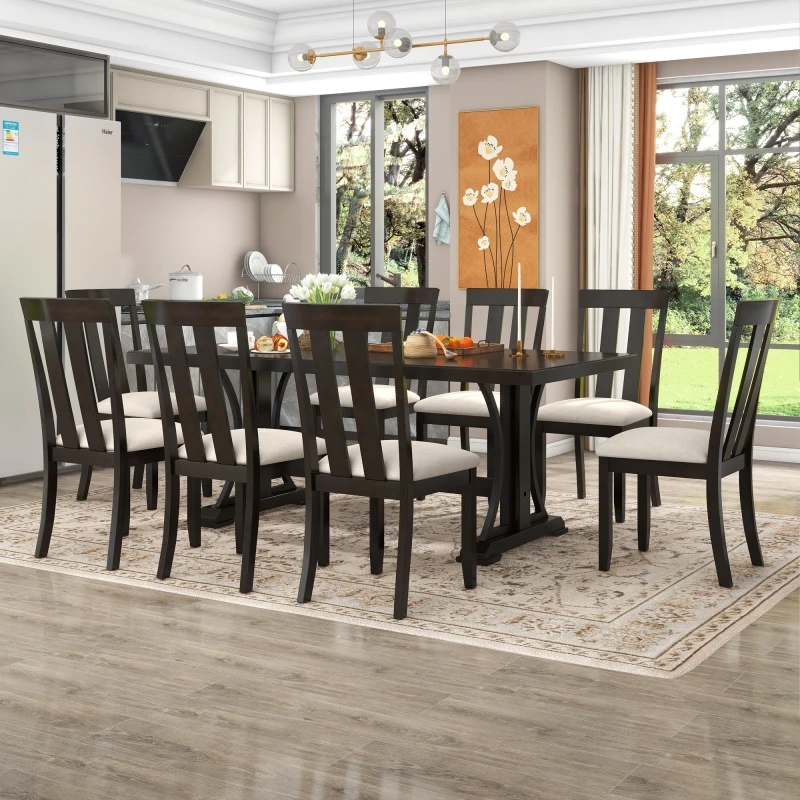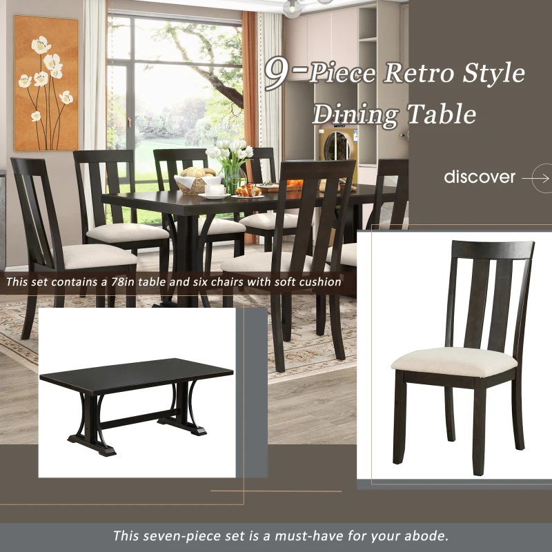 9-Piece Retro Style Dining Table Set 78" Wood Table 8 Dining Chairs