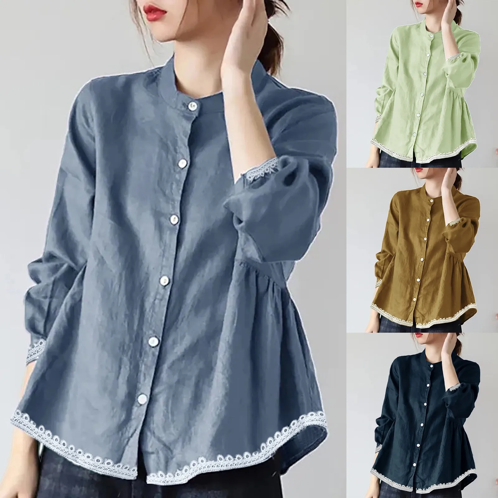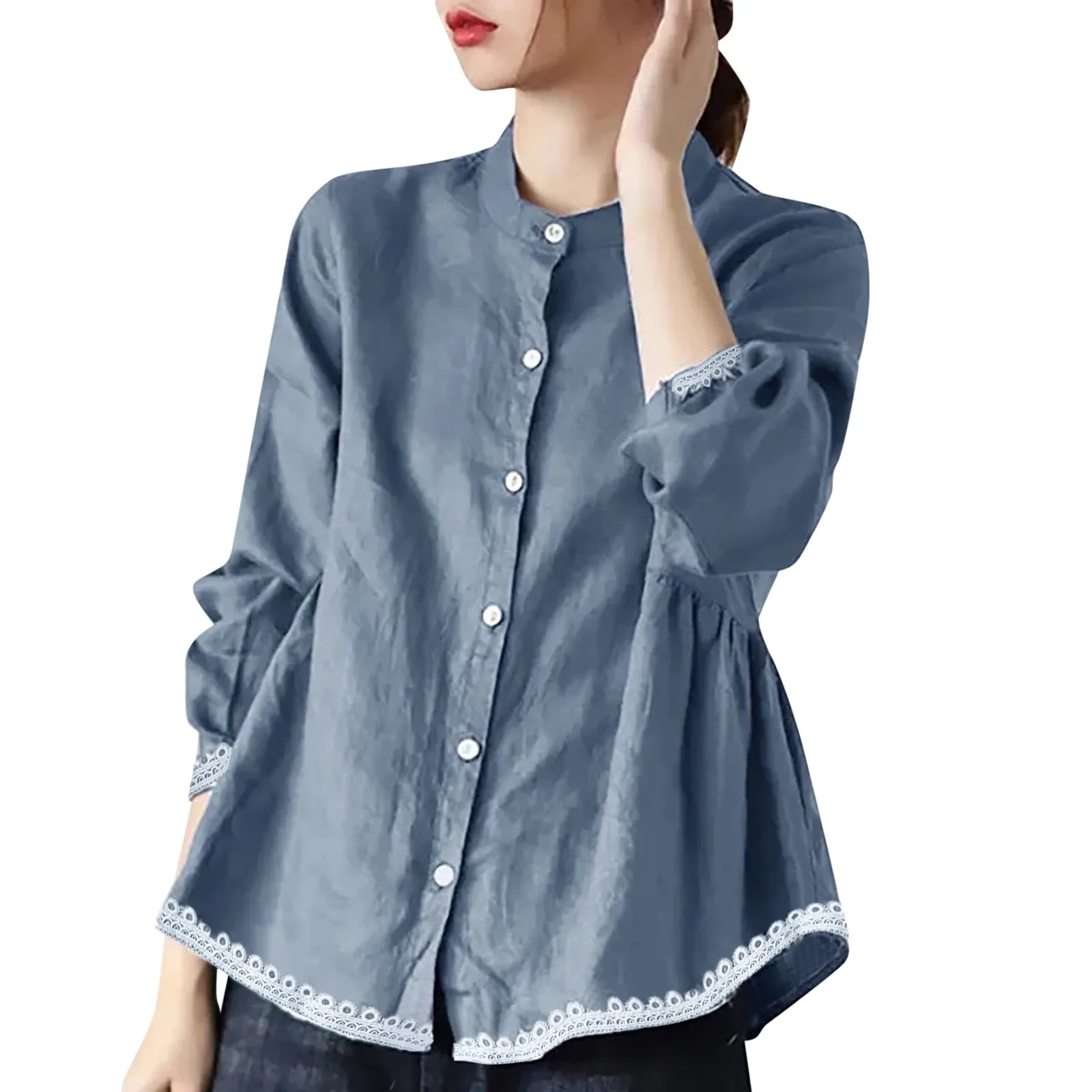 And Blouse Women's Stand Shirt Long Sleeve Loose Ruffled Shirt