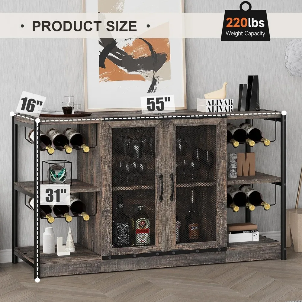 - 3. Ample Storage Space: With an overall size of 55" L x 16" W x 31.1" H, this wine bar cabinet offers generous storage space. The wine racks on the sides can hold 12 bottles, while the wine glass rack in the middle accommodates 12 wine glasses. The farmhouse-style cabinets in the middle are perfect for storing irregular bottles, liquor mixers, and cups.