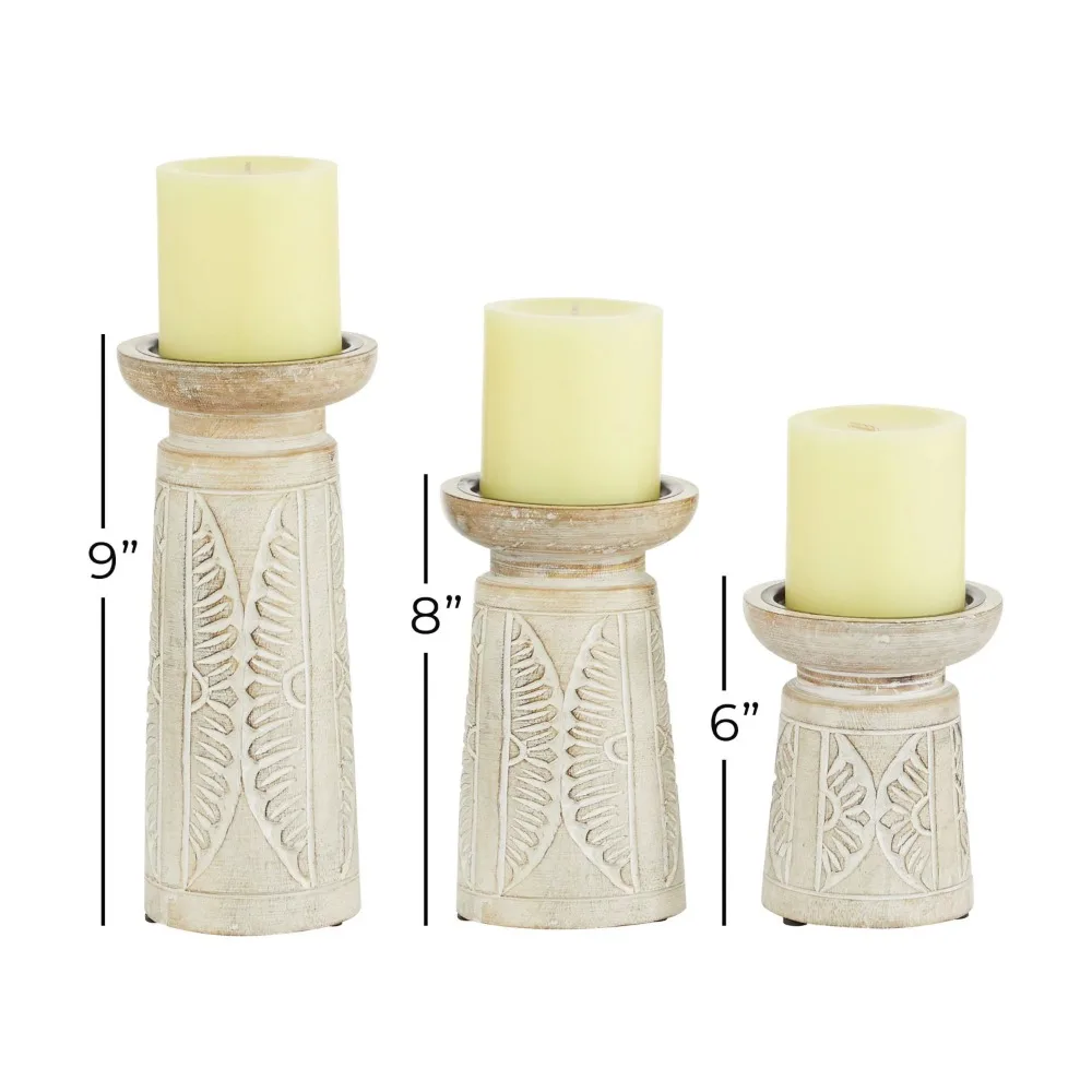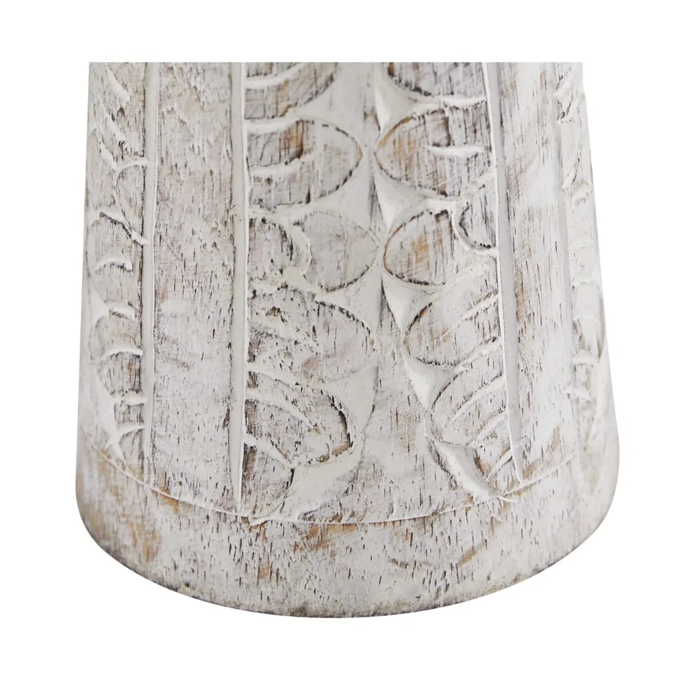 3 Candle White Wood Handmade Floral Intricate Carved Pillar Candle Holder, Set of 3 is a unique addition to your stylish home. Give your space a radiant illumination with these beautifully crafted candle holders. Made with a sturdy base, it is perfect for creating an elegant atmosphere at your table top or mantel. Use them as dim light holders in the dining area or as centerpieces on top of dressers and side tables in the living room.