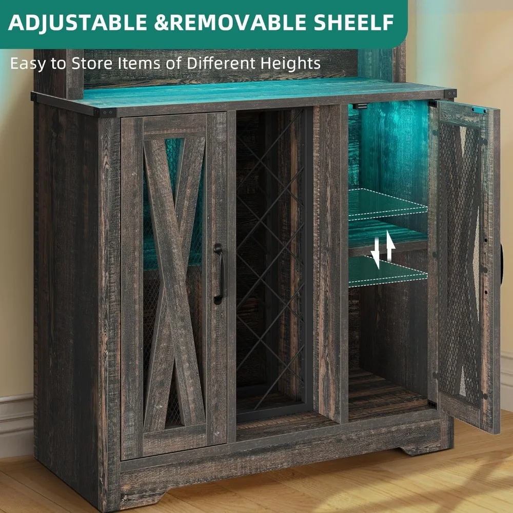 - Multipurpose Farmhouse Storage Cabinet: With black metal handles and wine rack, rustic wood grain and black metal mesh doors, create an elegant farmhouse ambiance in your living space. You can use it as a coffee bar, convenient for you drink coffee with a strong aroma at any time, enjoy your leisure time. Also as a microwave stand, kitchen sideboard, buffet cabinet, wine rack cabinet or toy cabinet. bar cabinets is a great addition for your home, meet your multi scenario usage needs!