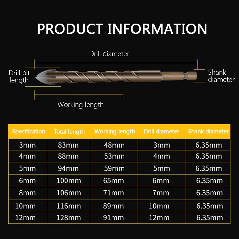 Drill diameter: 3mm/4mm / 5mm / 6mm/7mm / 8mm / 10mm / 12mm