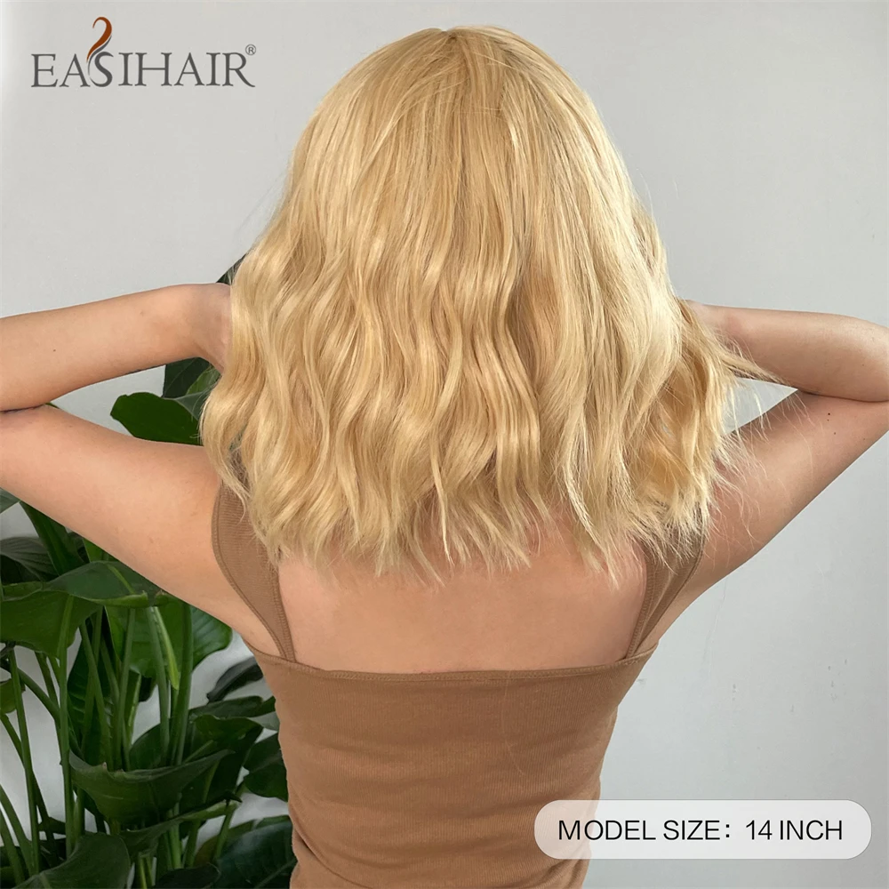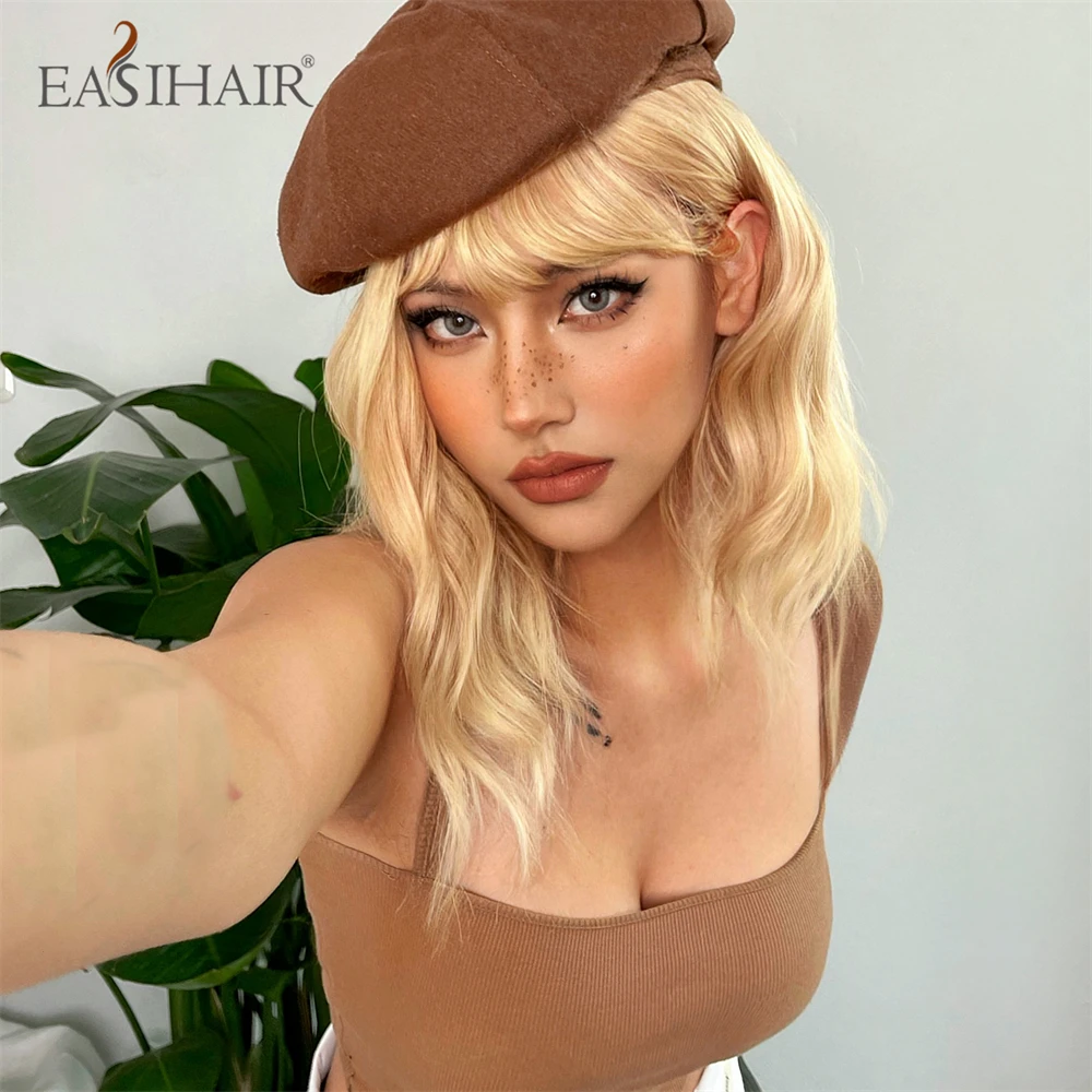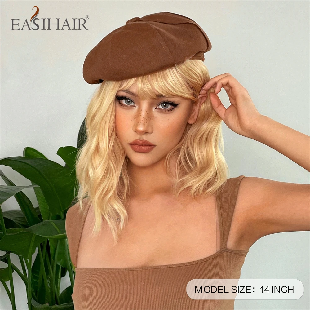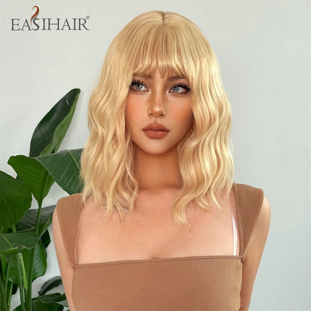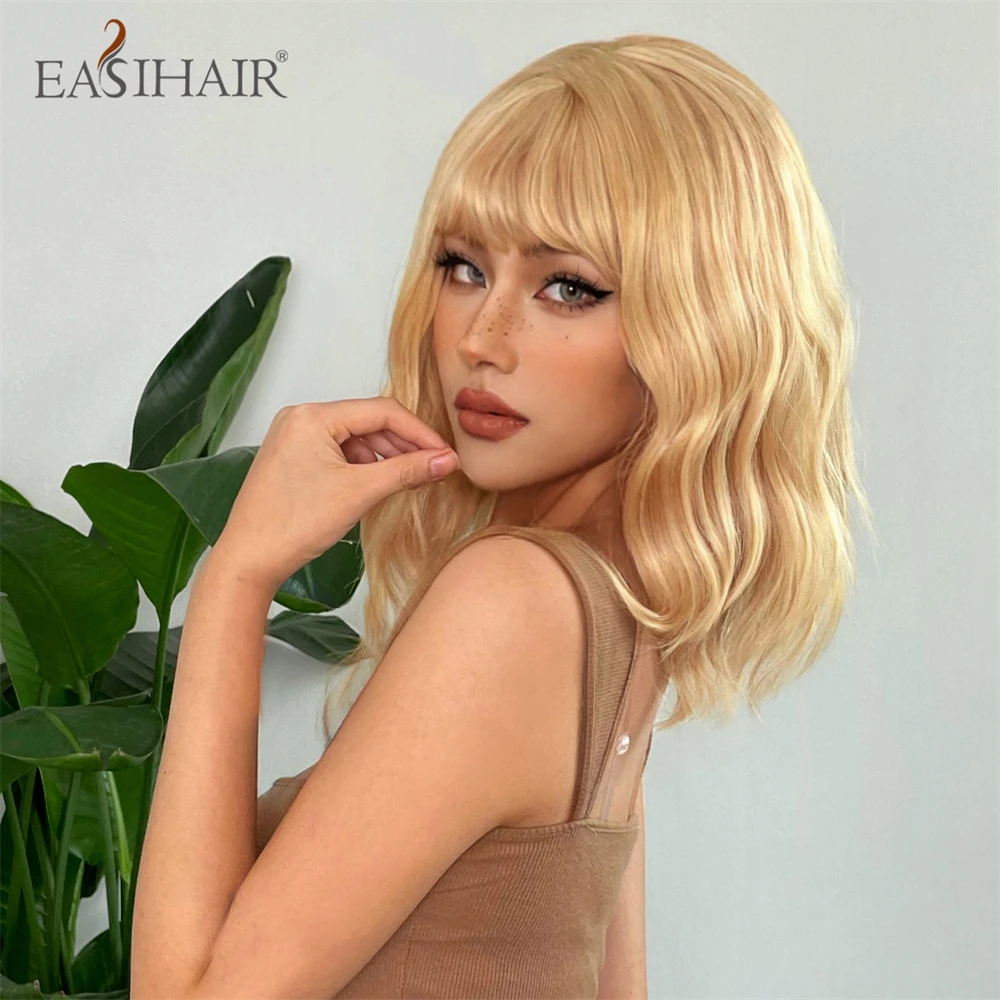 EASIHAIR Short Blonde Golden Lolita Cosplay Synthetic Wigs with Bang for Women Daily Natural Wavy Fake Hair Heat Resistant Fiber