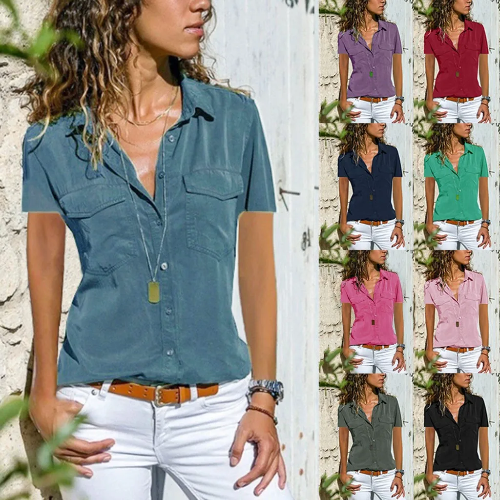 Fashion Women Turn-down Collar Shirts Summer Solid