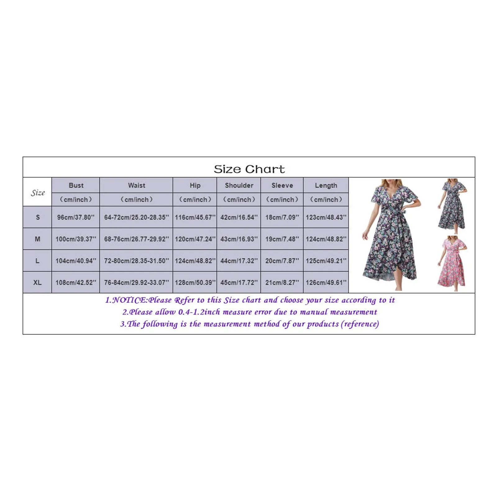 | Size:L | Bust:104cm/40.94'' | Waist:72-80cm/28.35-31.50'' | Hip:124cm/48.82'' | Shoulder:44cm/17.32'' | Sleeve:20cm/7.87'' | Length:125cm/49.21'' |