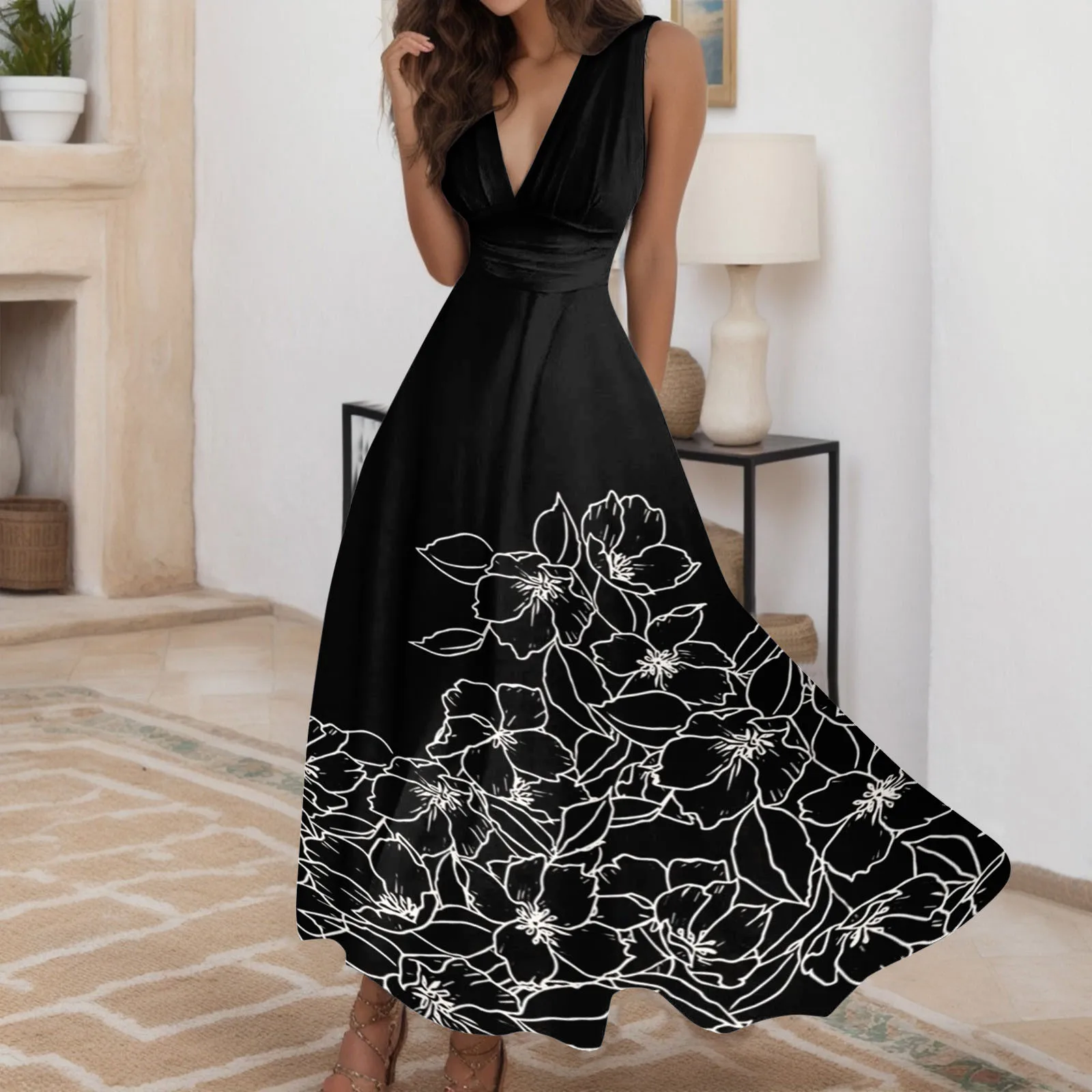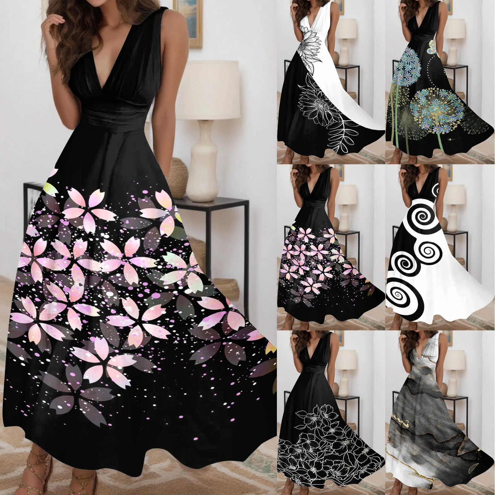 Floral Print Summer Sleeveless Dress Sexy Deep V Neck