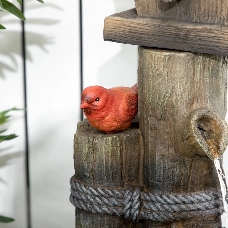 Our lighted log-style garden fountain features two functional birdhouses, making an excellent centerpiece that fits in with nature. Bring birds to your backyard; a continuous pump makes water trickle calmly between each basin, providing a bird bath next to their new home. Lights illuminate each log, making birds visible even at night. A cute little cardinal statue sets the tone, being decor when the birds are away. Rustic yet functional, it adds that extra touch that any Zen garden could use.