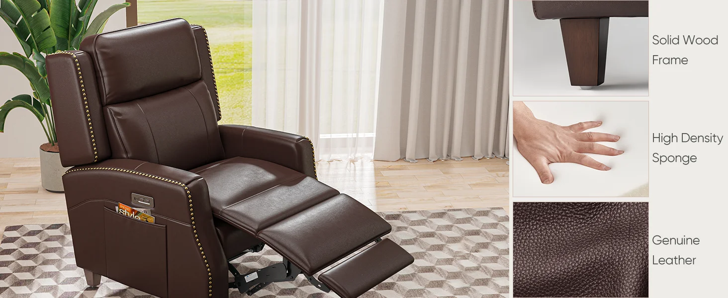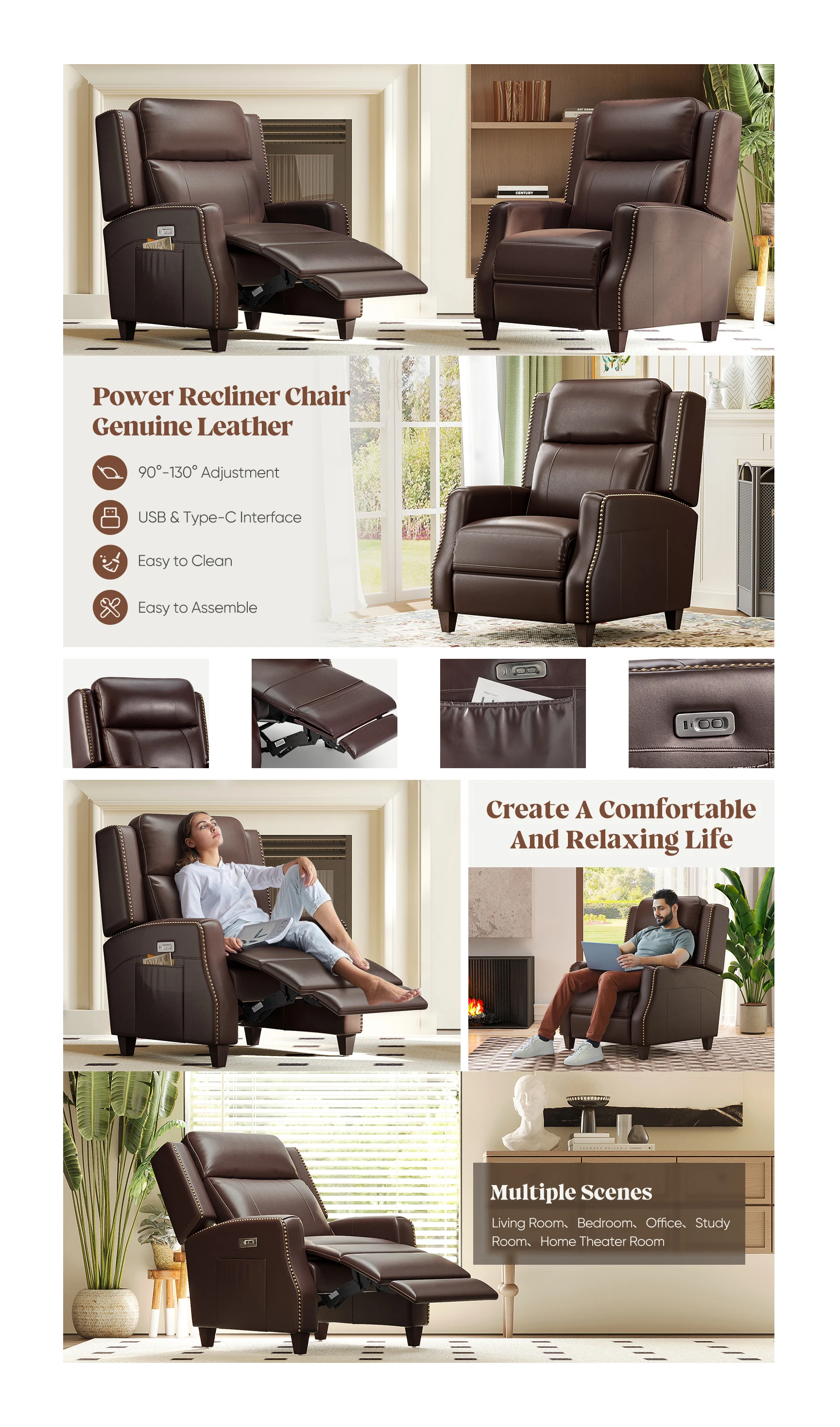 ❥ Stable and Durable Leather Recliner Chair - The large area outer shell is made of high-quality genuine leather with PU leather on the sides and storage pockets making it breathable and soft. The built-in high-end solid wood frame is hard and stable with strong corrosion resistance. Weight capacity: 400 lbs. Dimensions: 33"W x 37"D x 40"H Seat Dimensions: 21"W x 21"D x 21"H.