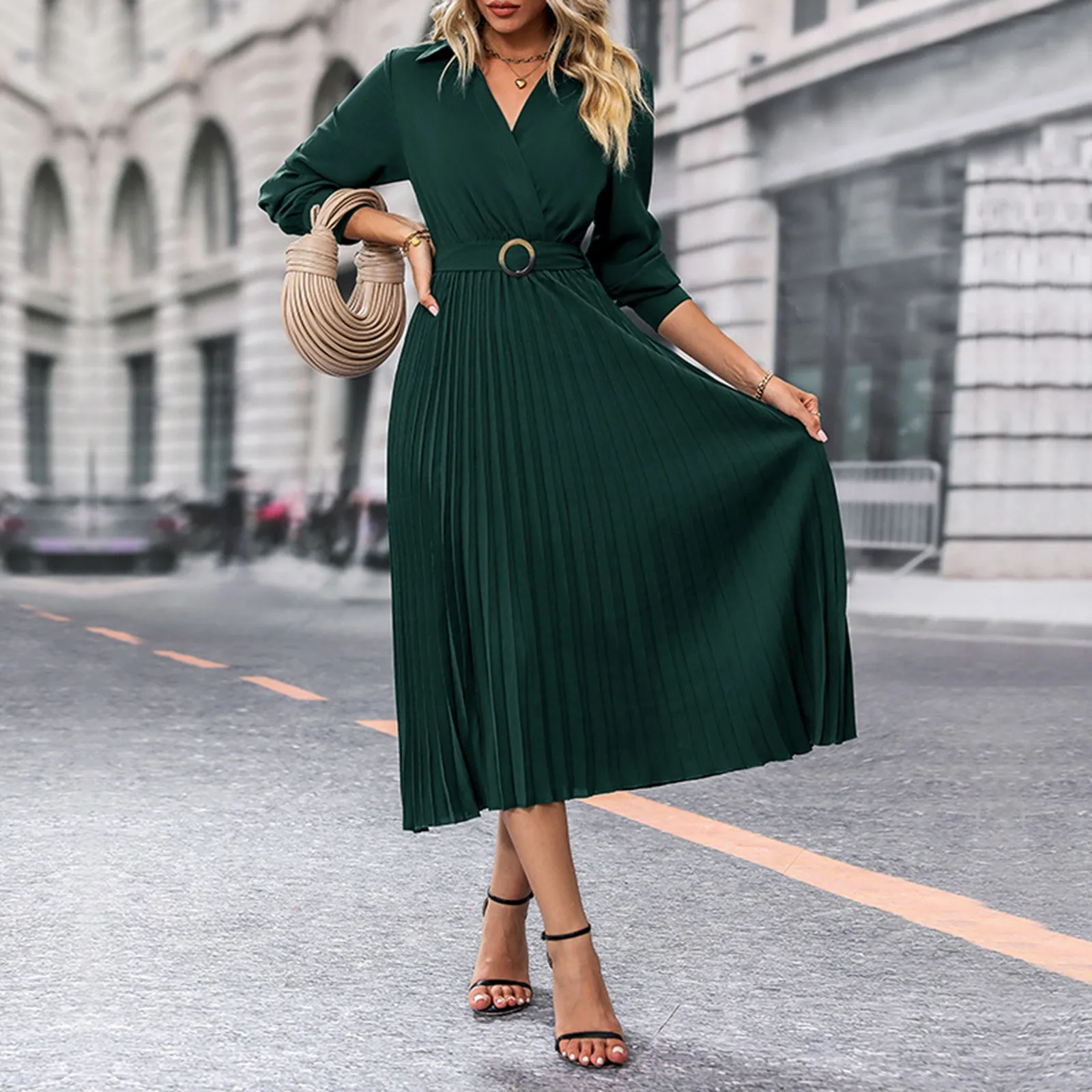 High Street A Line Long Dresses Ladies Lapel Pleated Dress