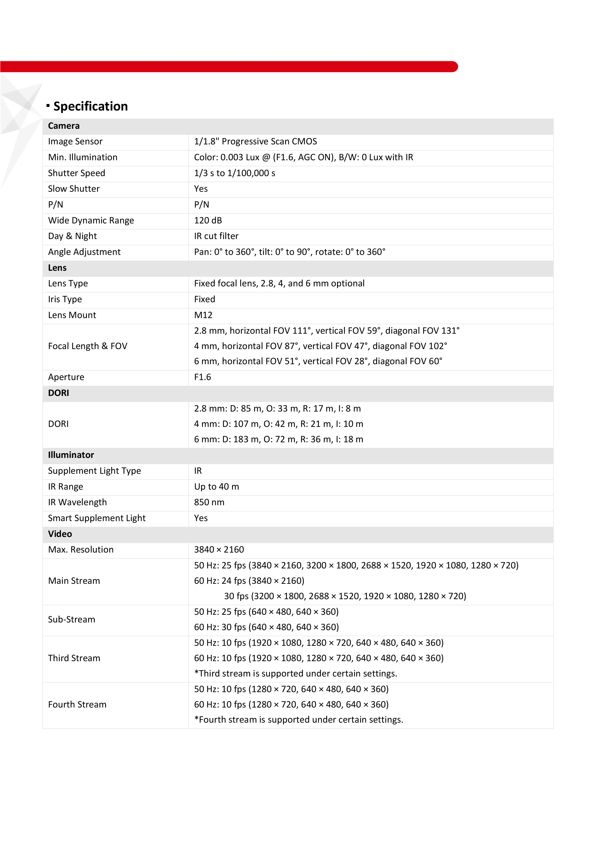 Minimum Illumination(Lux): Color: 0.003 Lux @ (F1.6, AGC ON), 0 Lux with IR