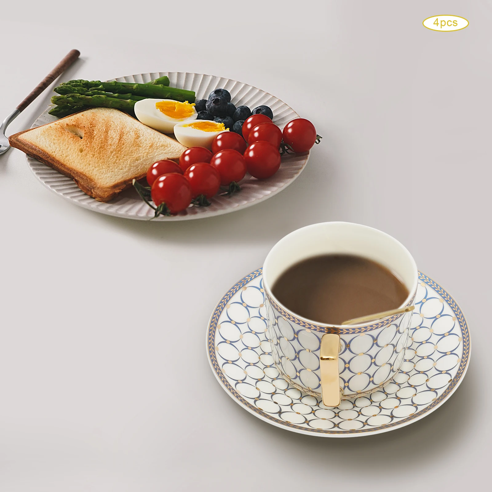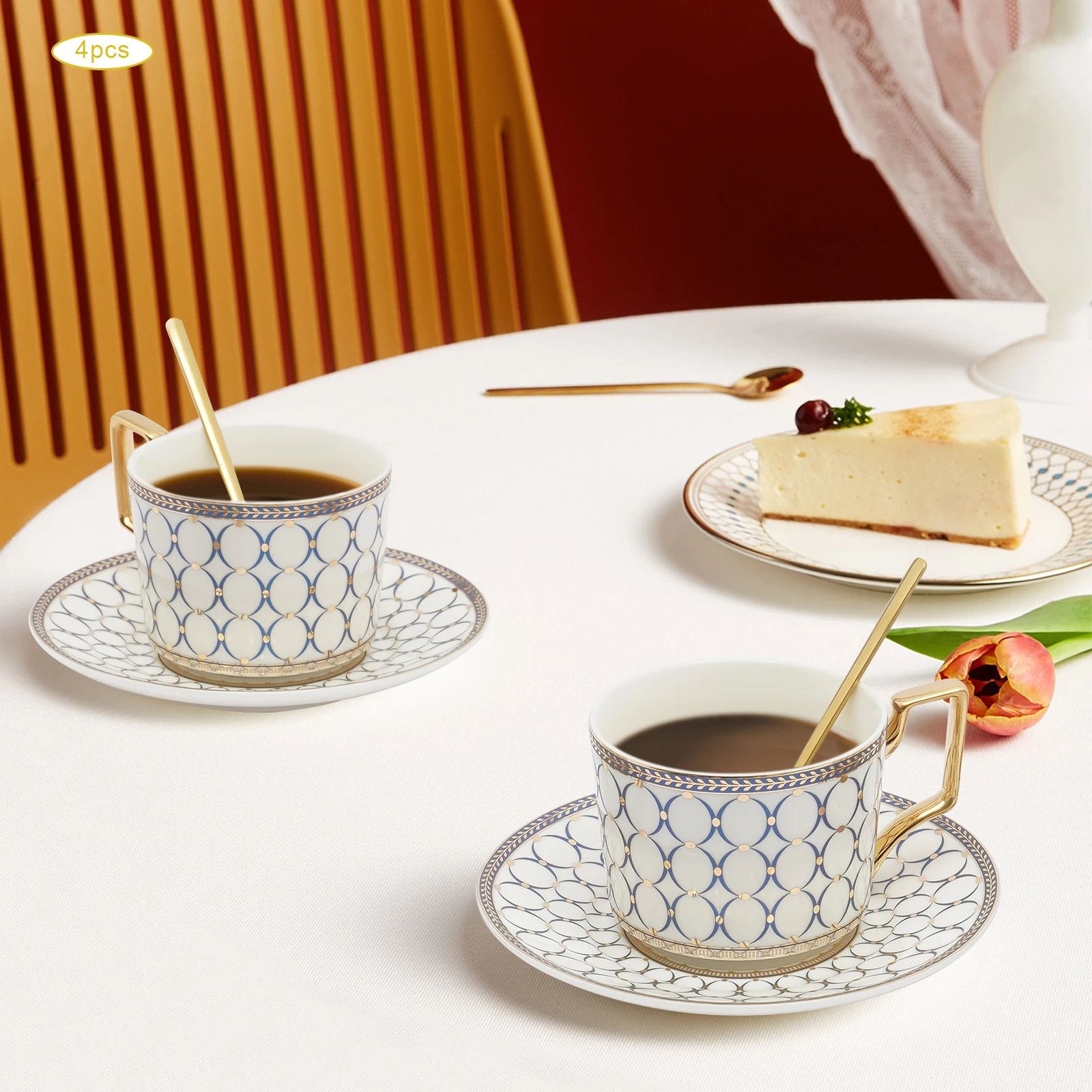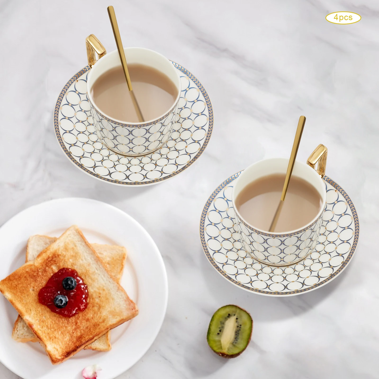 Excellent Cup&Saucer Set: Four tea cups(each of 7Oz) are in the right size to get rid of refill troubles and the right thickness to keep coffee warm/cold and retain aroma very well. Four saucers(each of 5.91" D) can be used as tea or fruit plates. So you and your friends will enjoy a pleasant afternoon tea time.