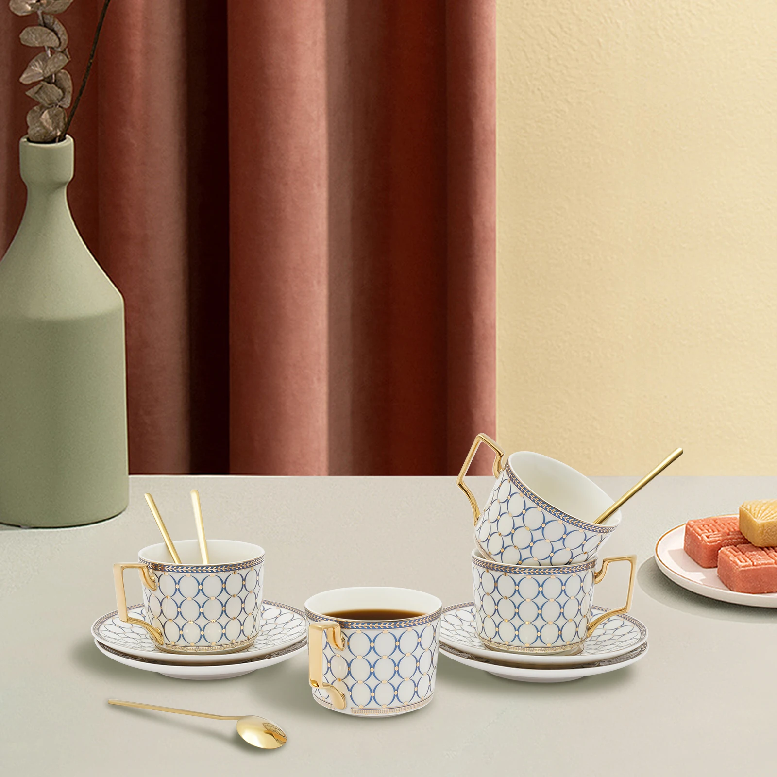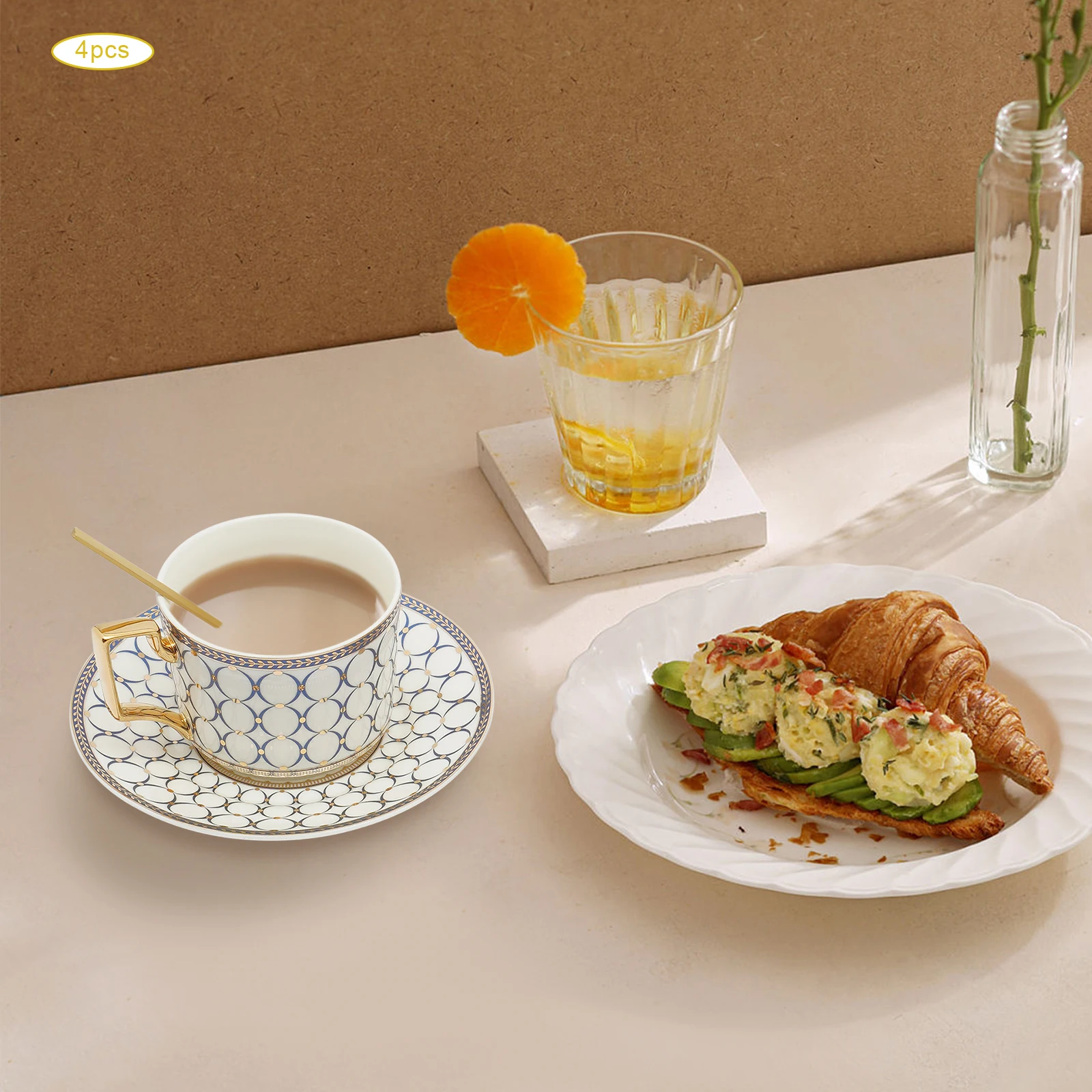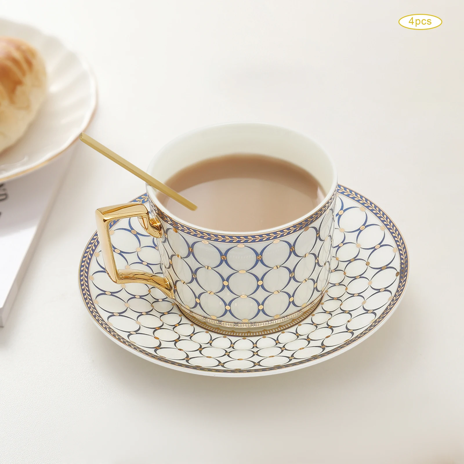 Excellent Cup&Saucer Set: Four tea cups(each of 7Oz) are in the right size to get rid of refill troubles and the right thickness to keep coffee warm/cold and retain aroma very well. Four saucers(each of 5.91" D) can be used as tea or fruit plates. So you and your friends will enjoy a pleasant afternoon tea time.