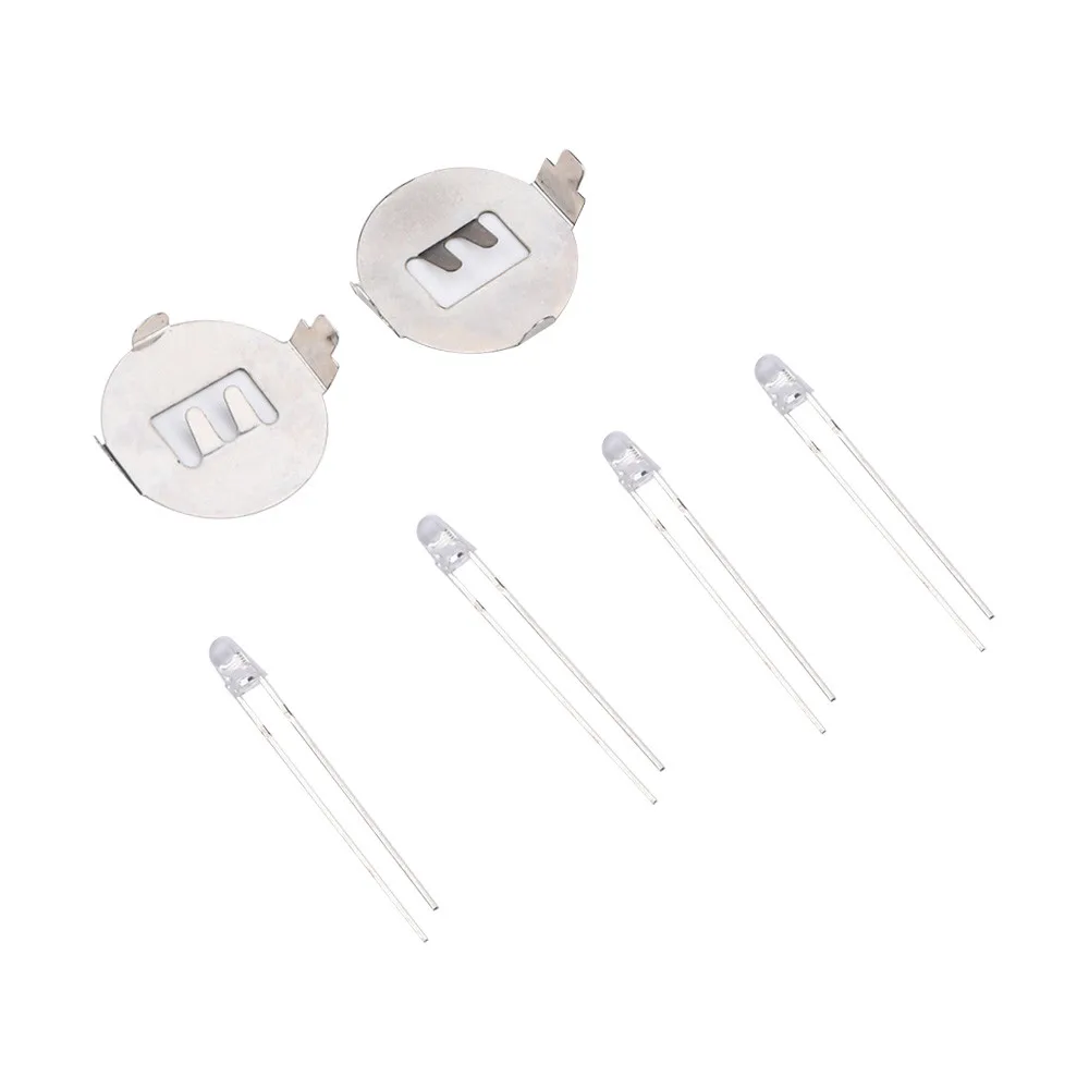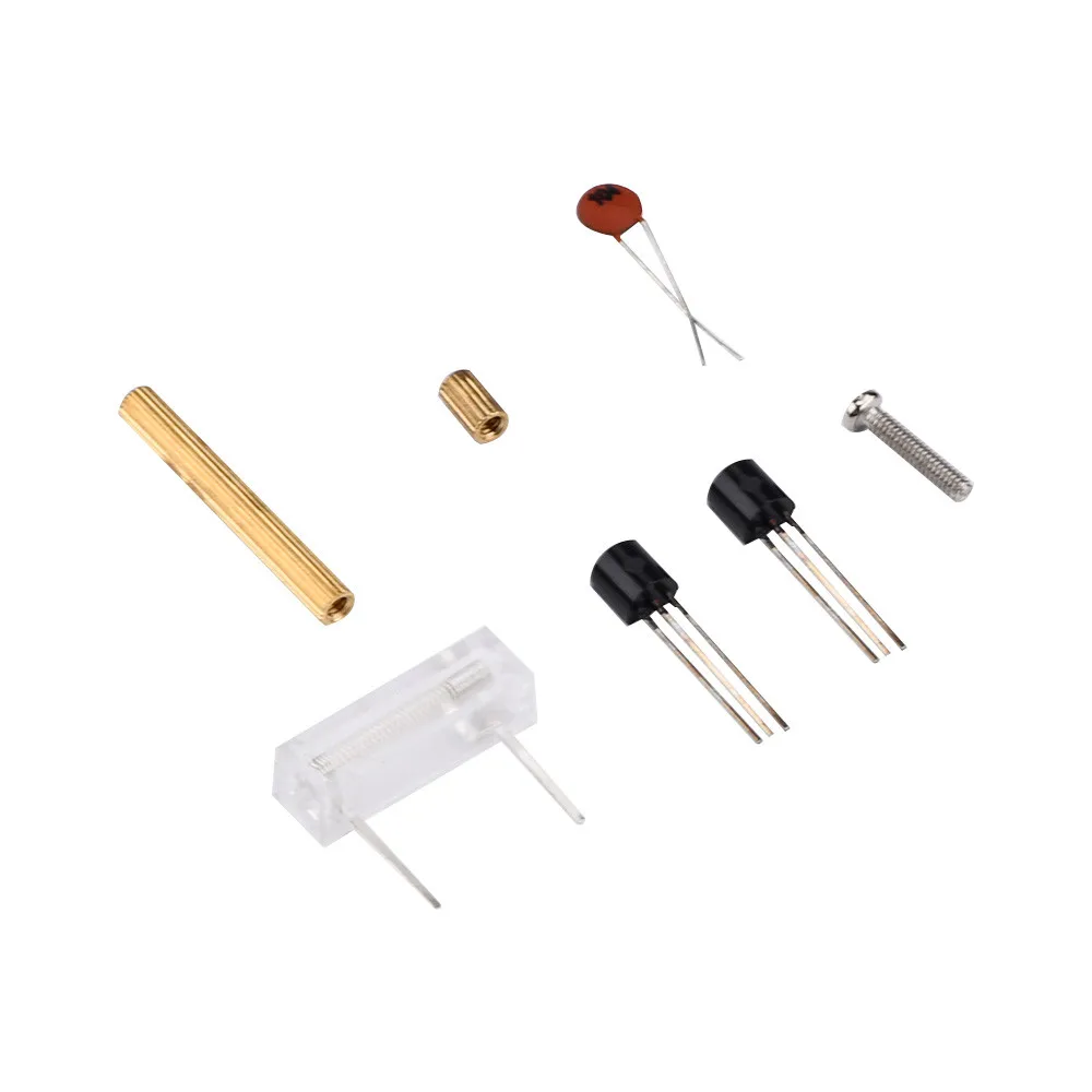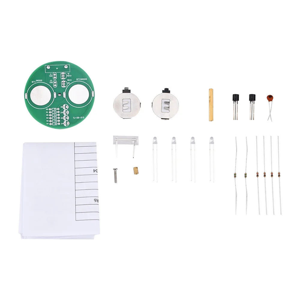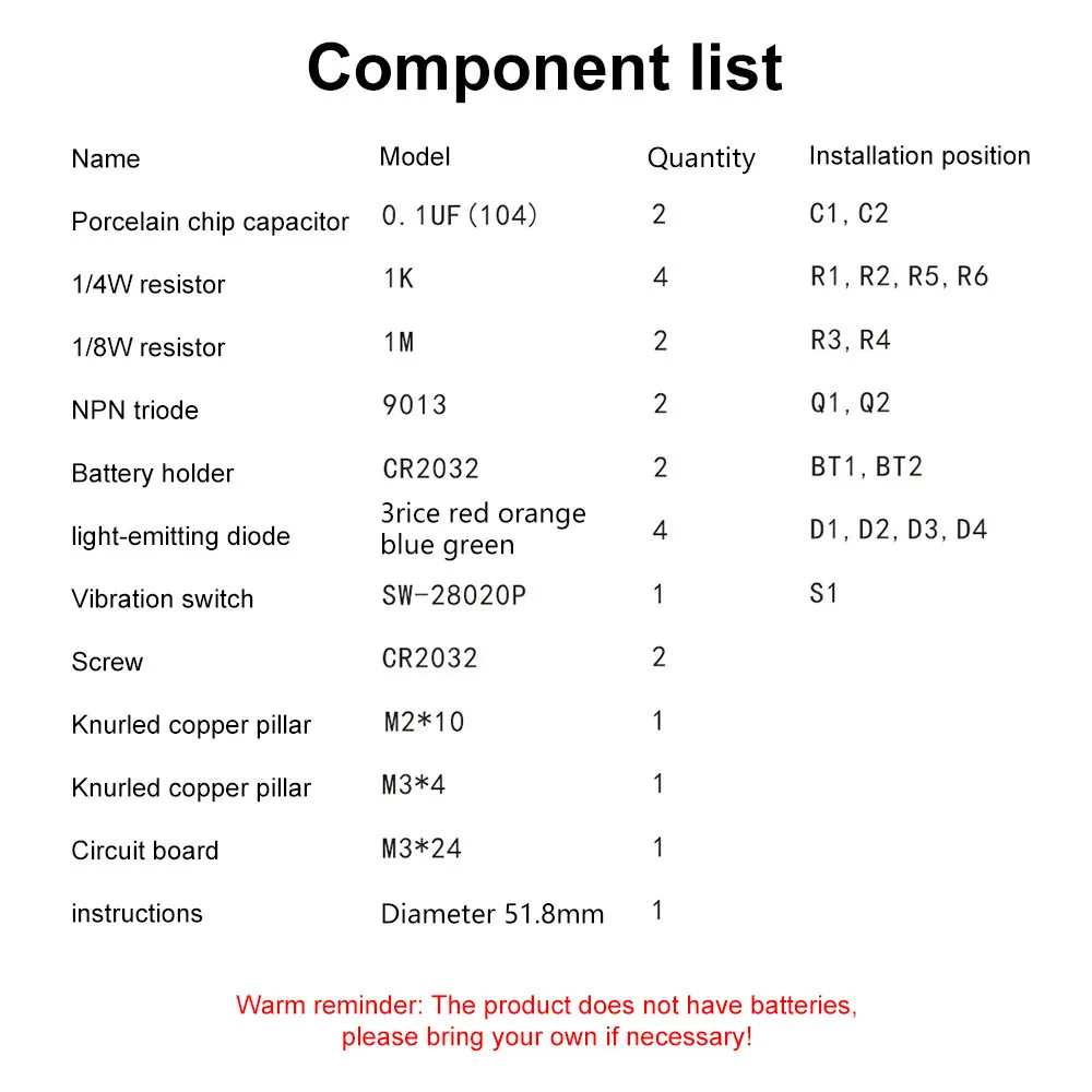 104 Chip capacitance *2+1K resistance *4+1M resistance *2+9013 transistor *2+ battery holder *2+3mmLED*4+M2*10 screws *1+M2x4 copper column *1+M2x24 copper column *1+ vibration switch *1+ circuit board *1+ manual *1