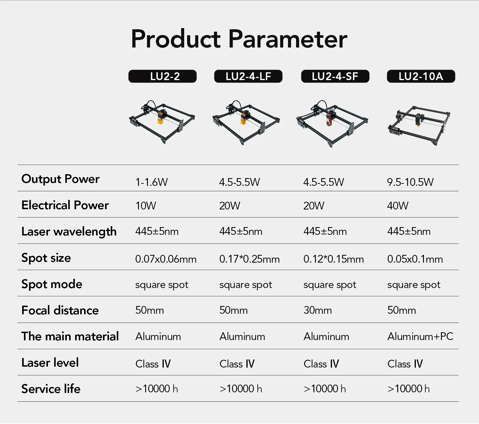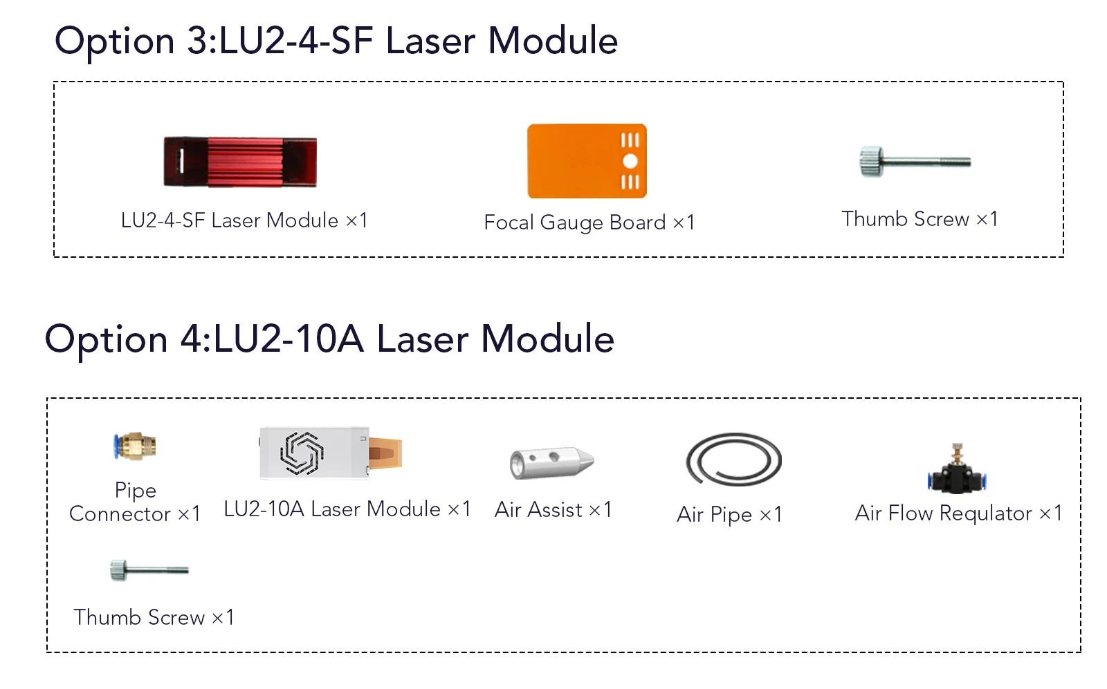 Control Softwares: LaserGRBL (free), LightBurn (Paid Software)