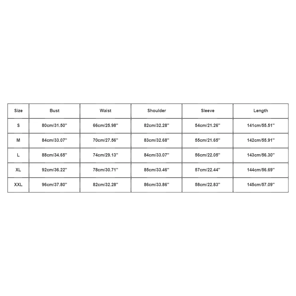 | Size:S | Bust:80cm/31.50'' | Waist:66cm/25.98'' | Shoulder:82cm/32.28'' | Sleeve:54cm/21.26'' | Length:141cm/55.51'' |