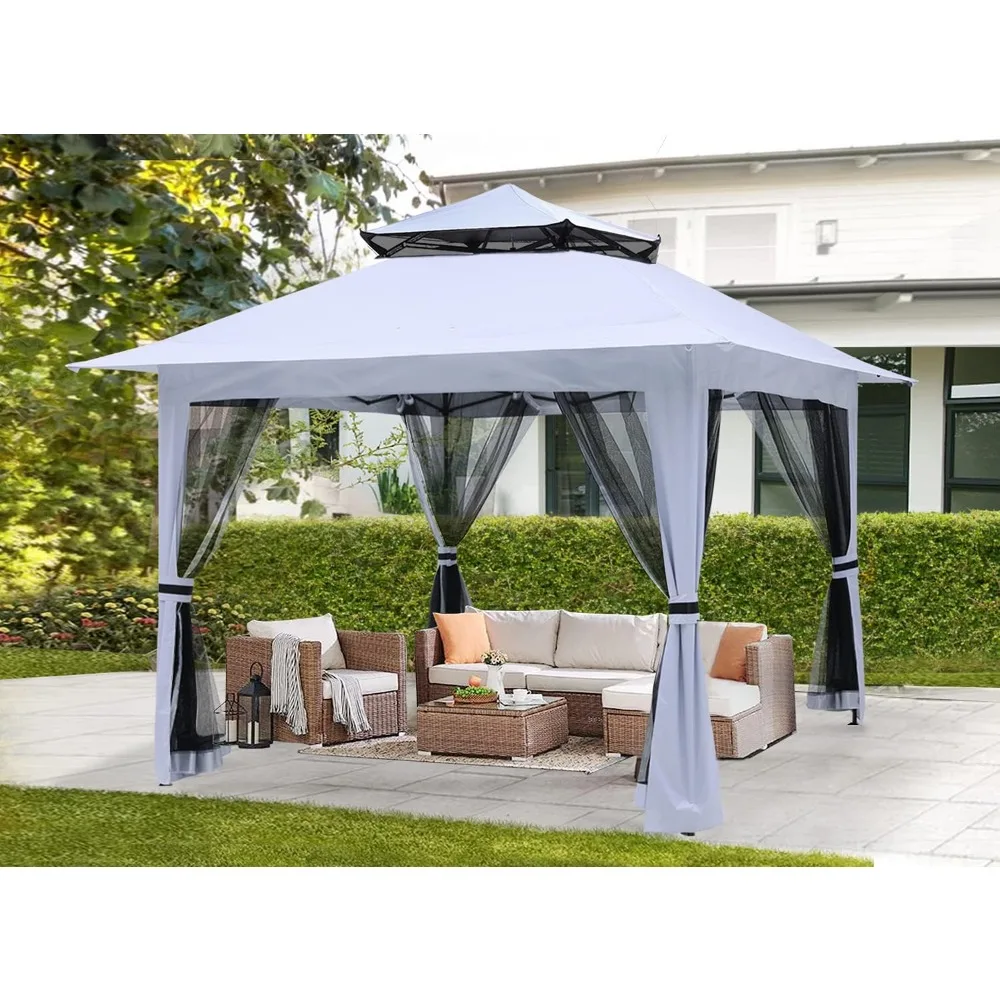 - MORE SHADE: This gazebo designed with EXTRA AWNING,10'x10' straight leg frame and13'x13' coverage at the top, provides 169 square feet of coverage, roomy enough to accommodate 8-12 people and some chairs. Four removable zippered mesh walls services as a barrier to against small things, and provide MORE PRIVACY.