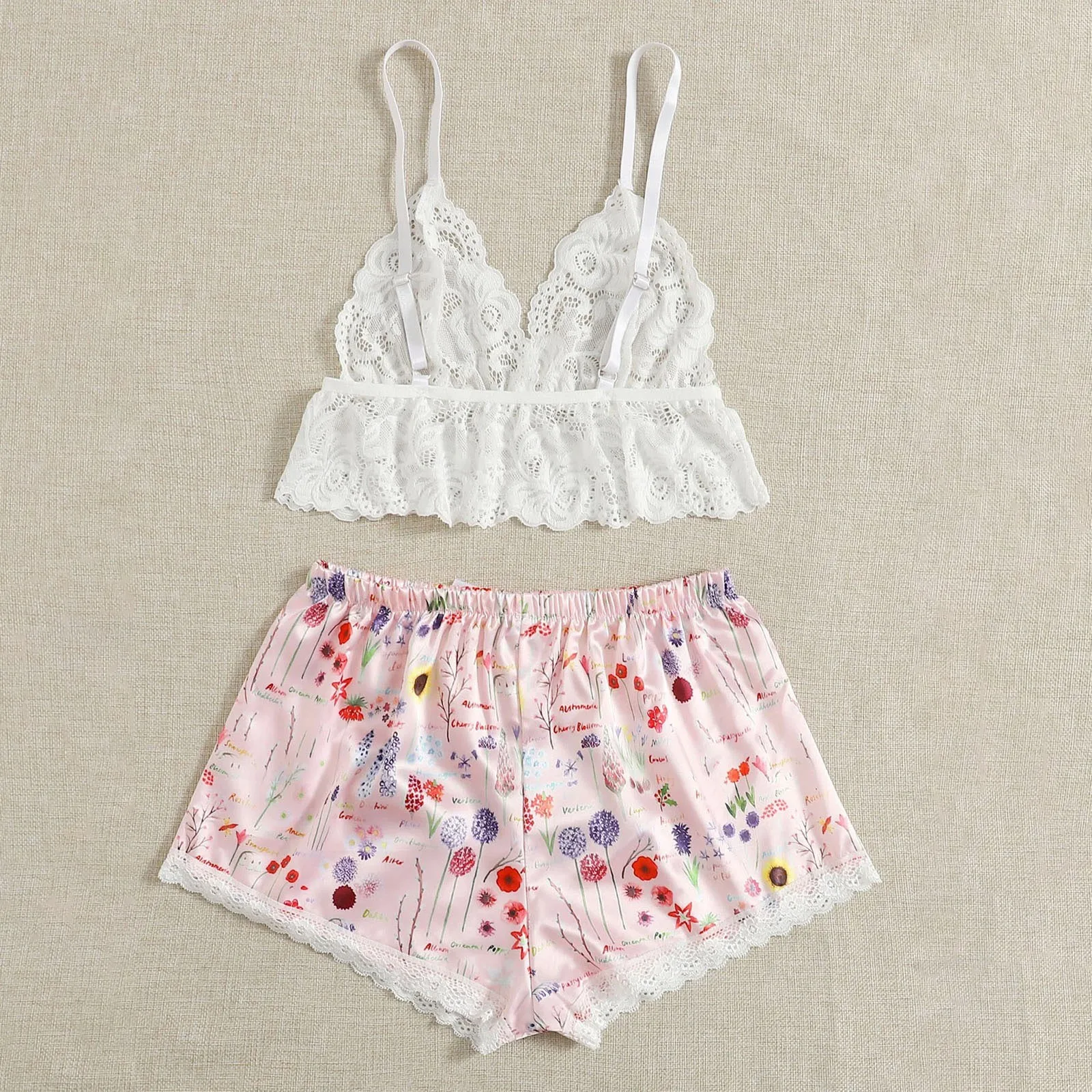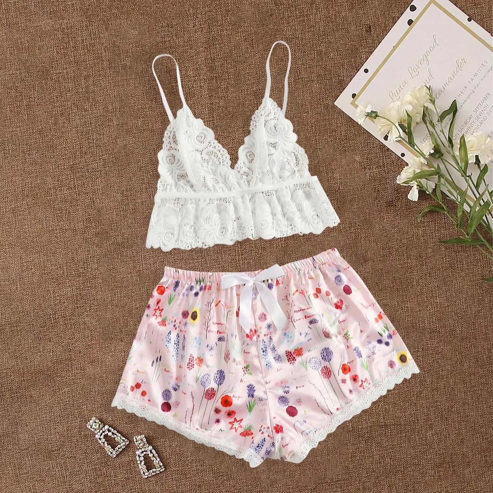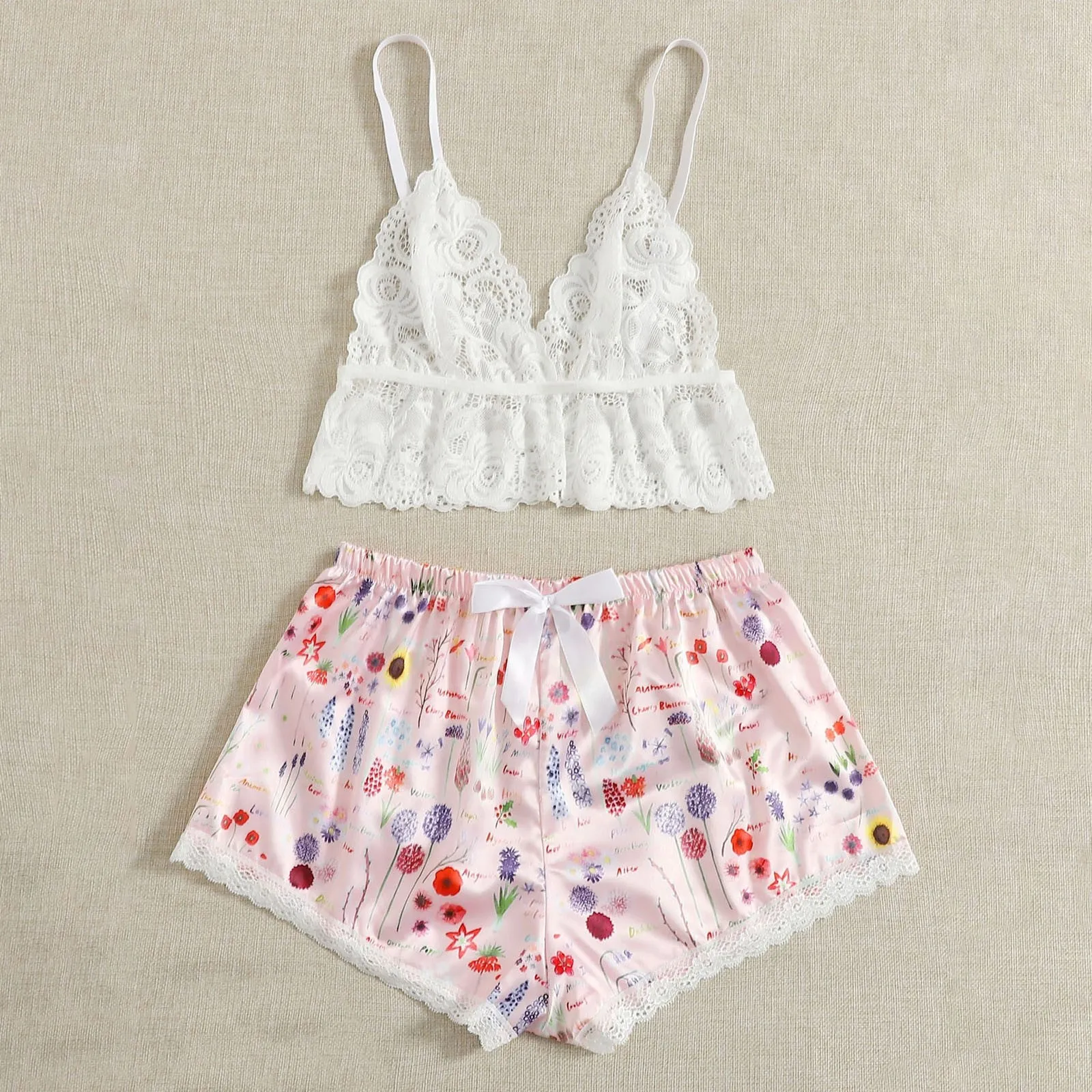 Pyjama Sets Femme Women V-neck Silk Lace Satin