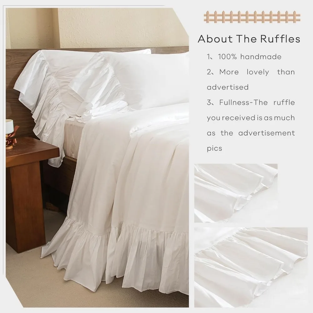Queen's House White Ruffles Bed Sheet Set Cotton 4-Piece King