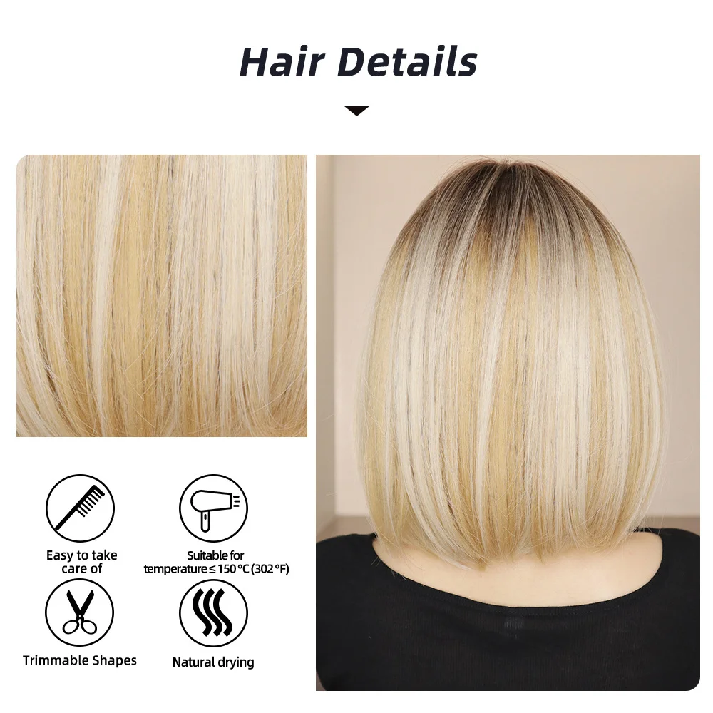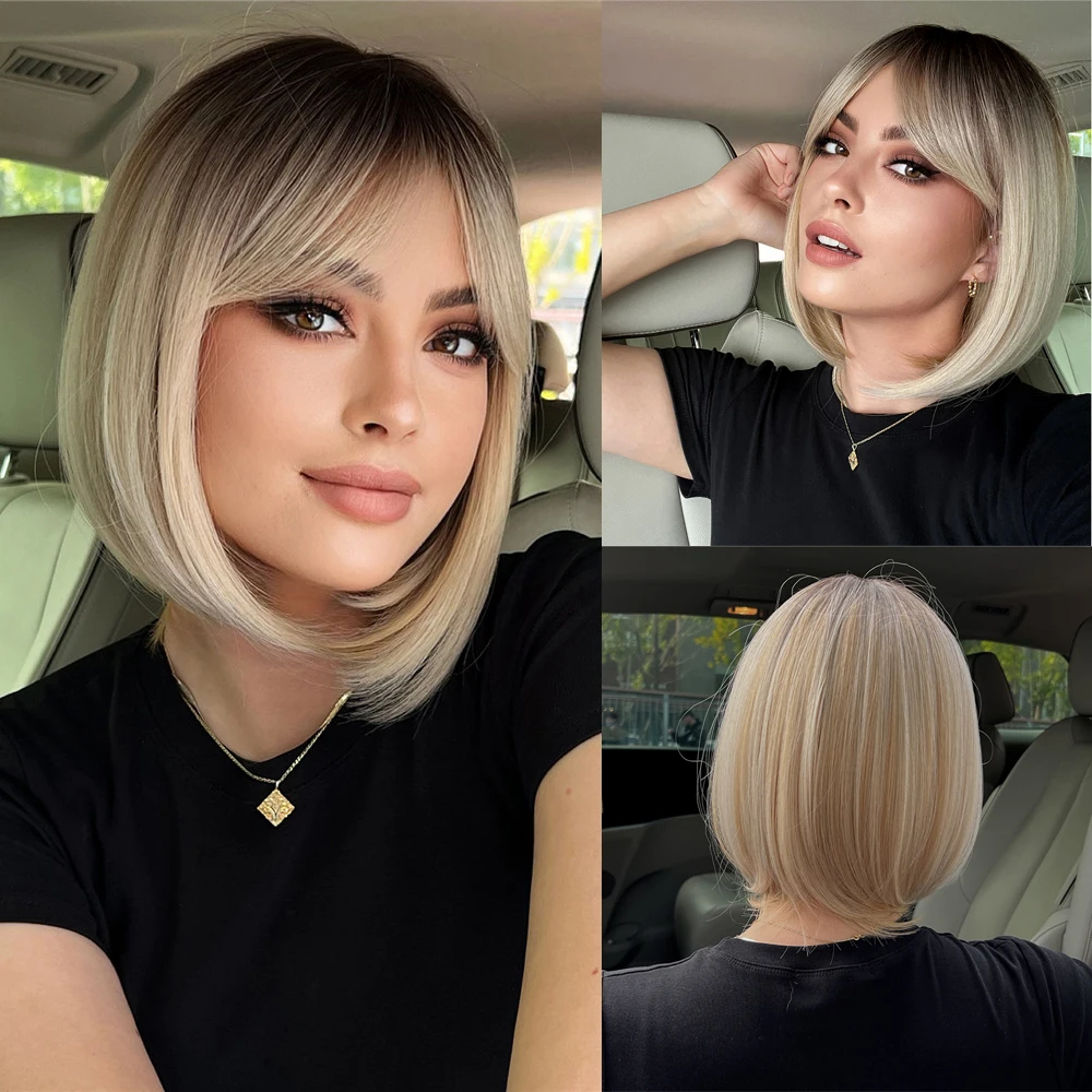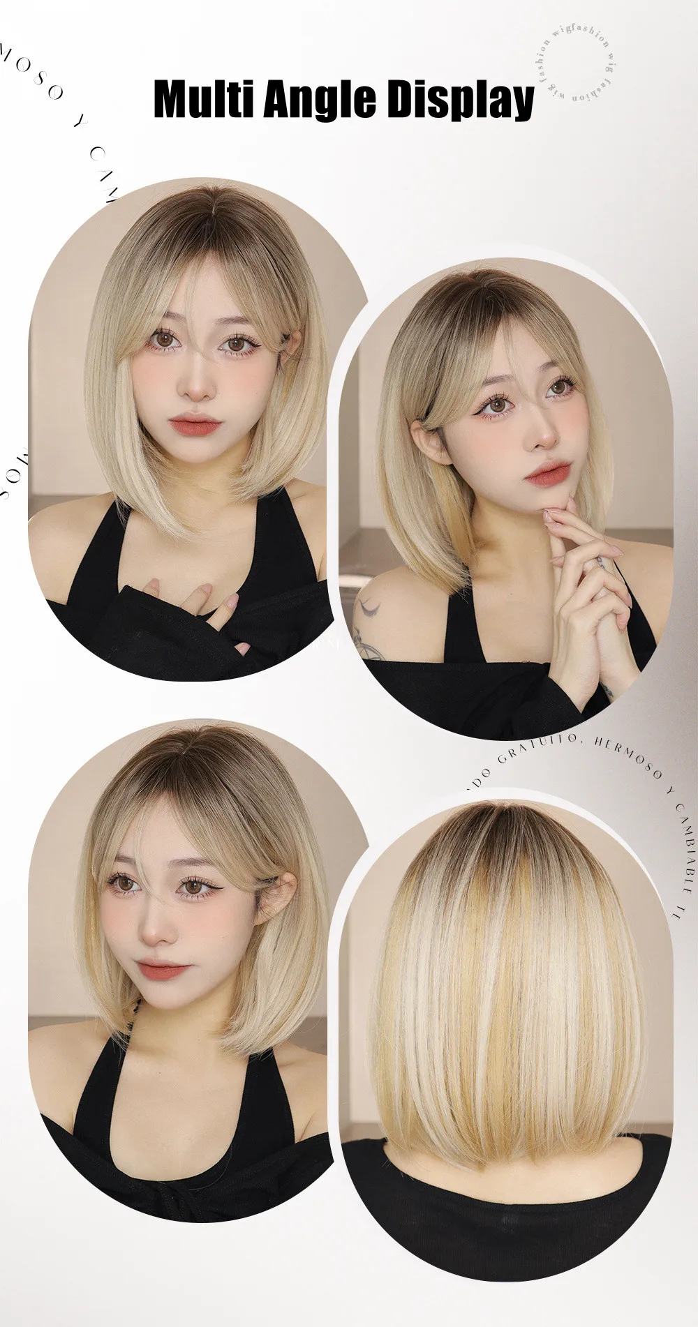 Short Blonde Highlight Bobo Wig for Women Straight Natural Party Daily Wig with Bangs Soft Cosplay Synthetic Hair Heat Resistant