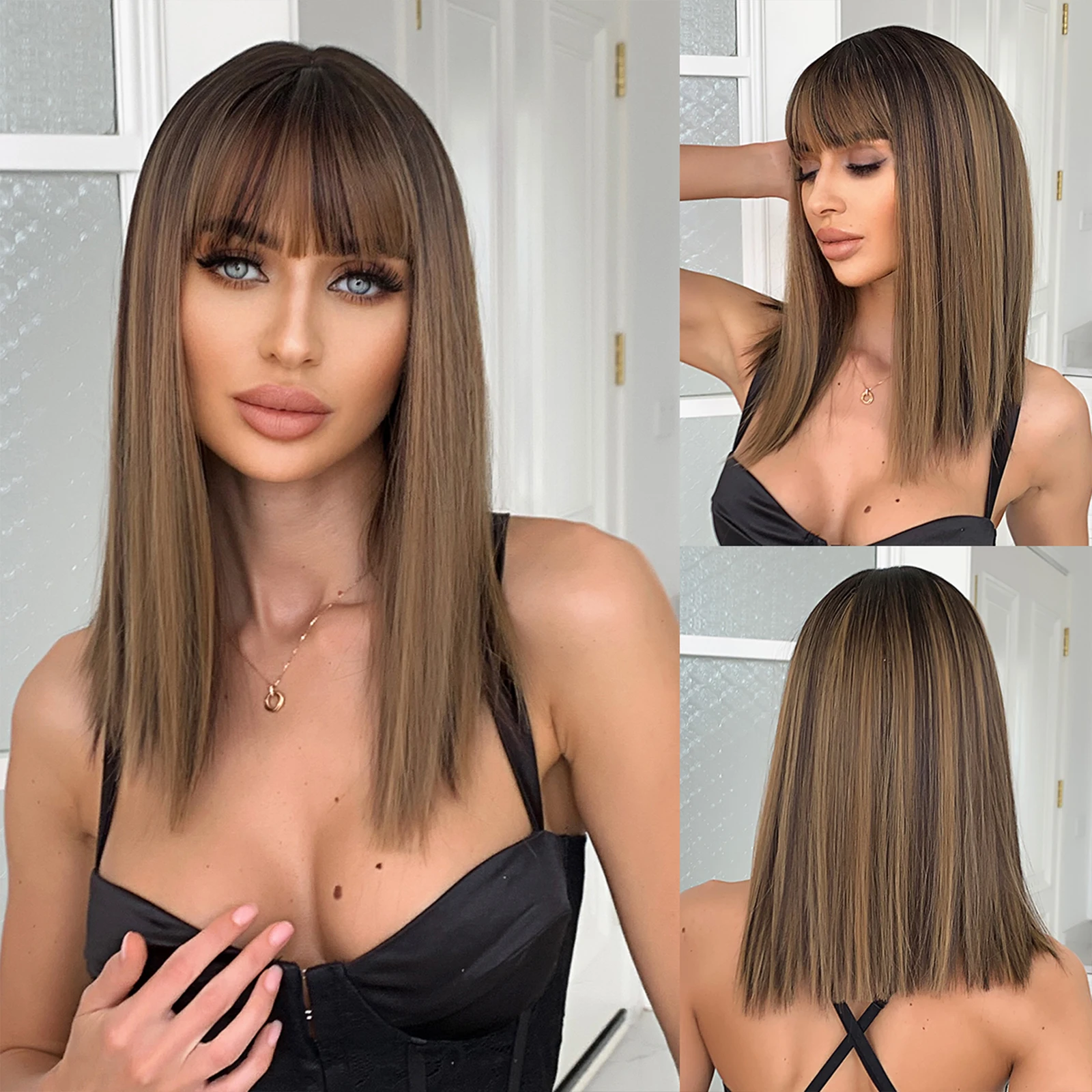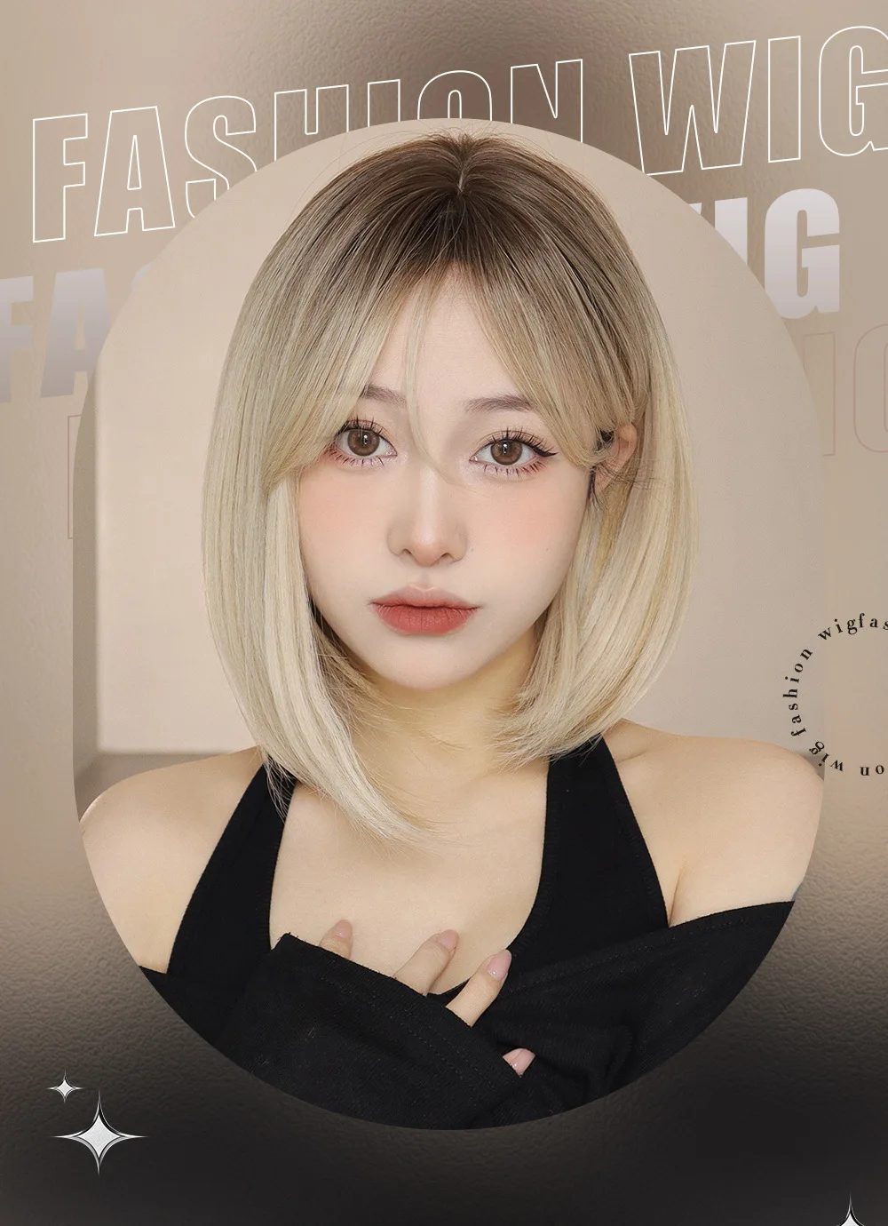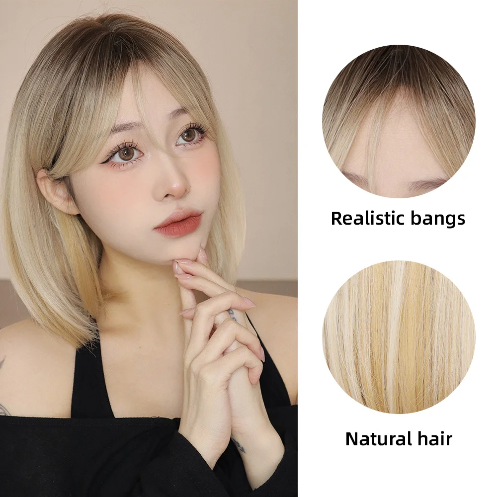 Short Blonde Highlight Bobo Wig for Women Straight Natural Party Daily Wig with Bangs Soft Cosplay Synthetic Hair Heat Resistant