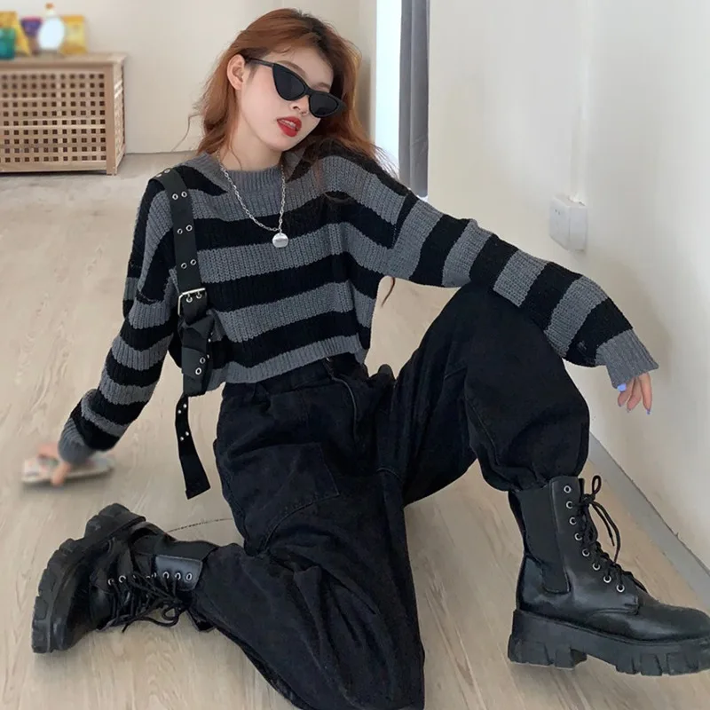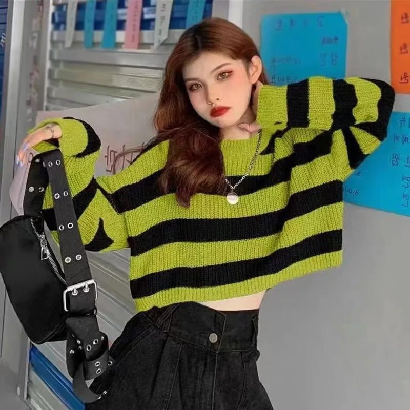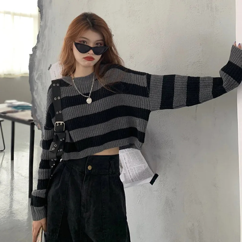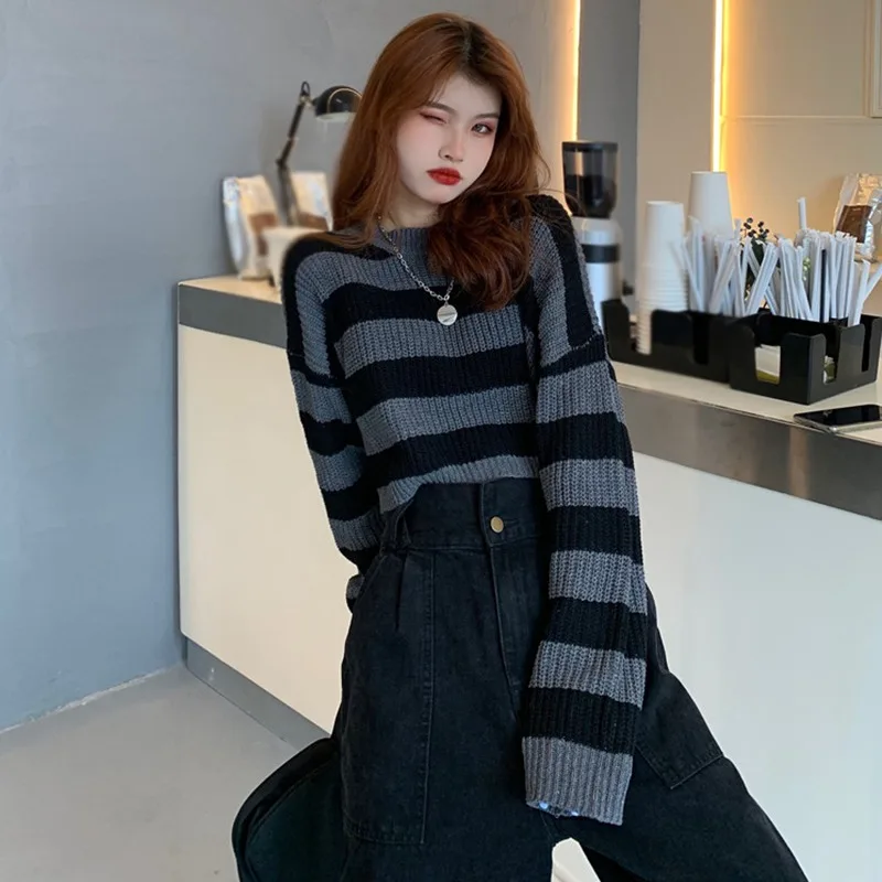 Striped Cropped Sweater Women Vintage Oversize Knit Jumper