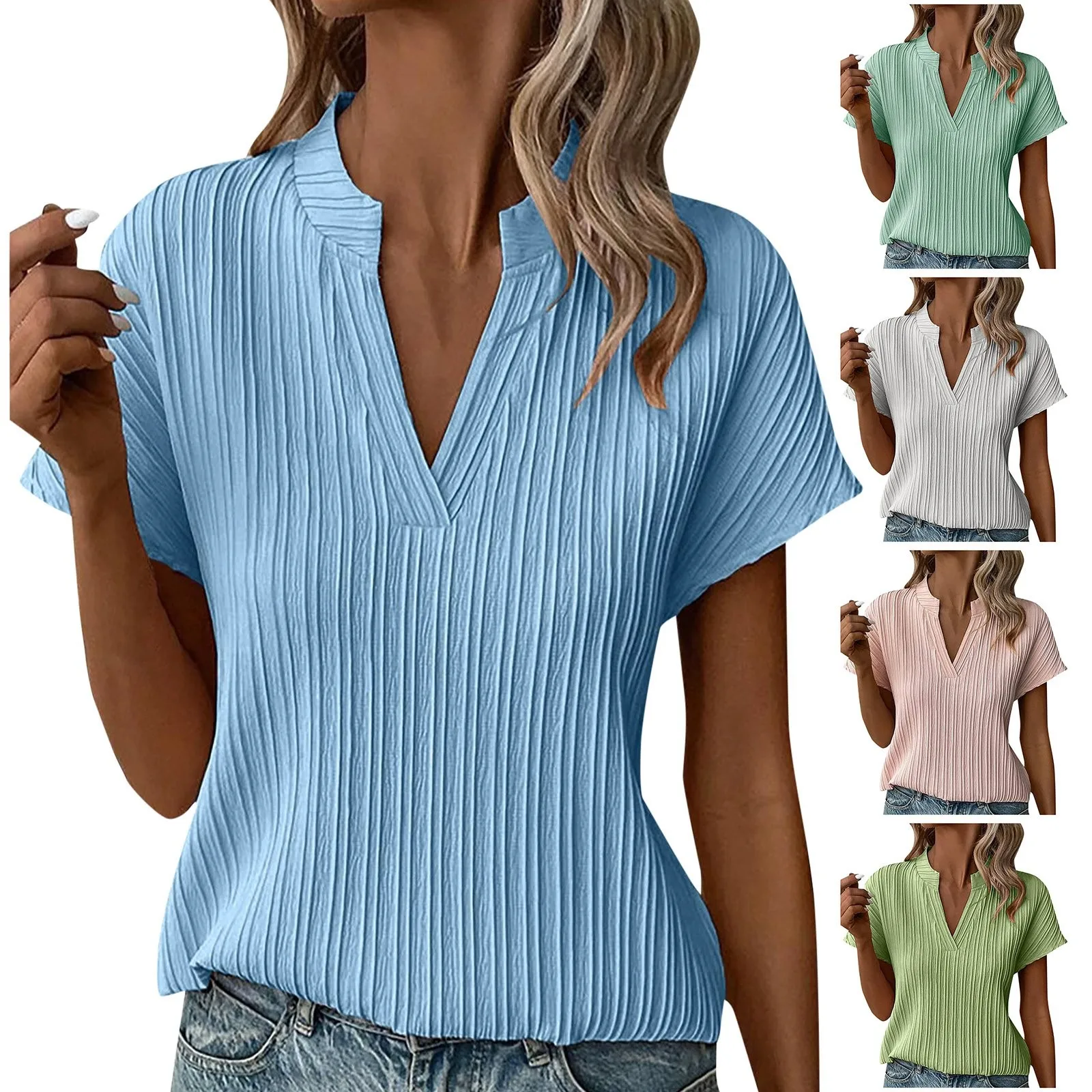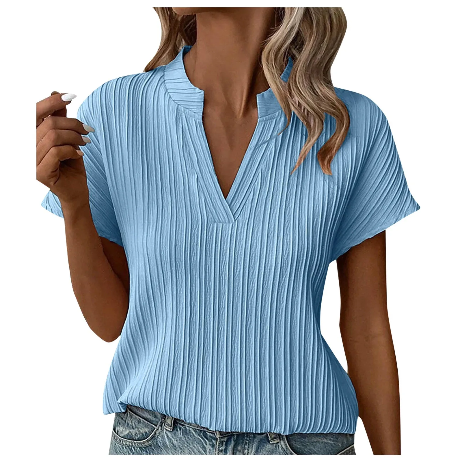 Summer V Neck T Shirts For Women Pleated Puff Sleeve Tops