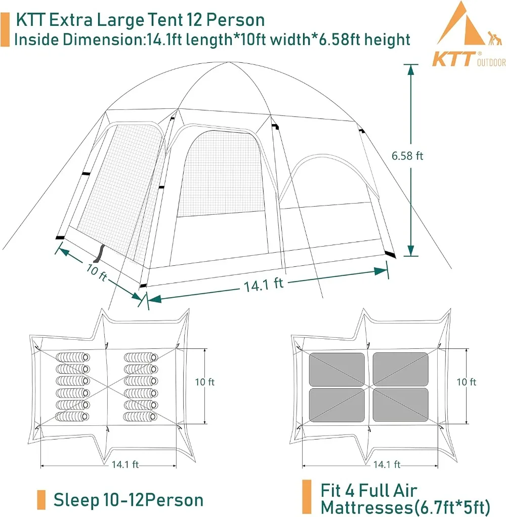 - Large space:Inside dimension14.1ft length*10ft width*6.58ft height, fit 4 full air mattresses(6.7ft*5ft/200cm*150cm),can accommodate 10~12 person,3 doors with mesh,3 Windows with mesh,divided into two rooms by separation curtain.