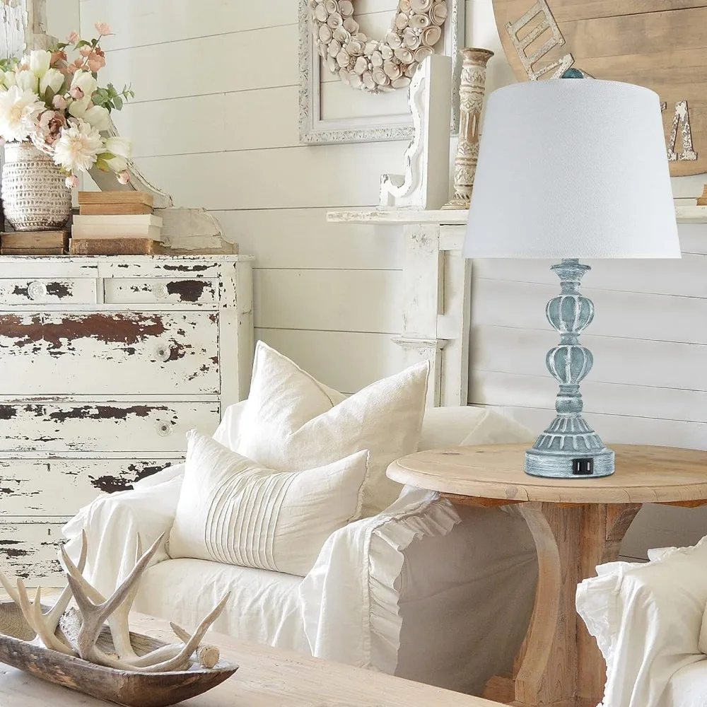 Blue Washed White Finish The vintage table lamp features a unique cottage antique blue finish over its intricate shapes and defined lines, bringing artistic charm as well as a sense of elegant whimsy to your space. |