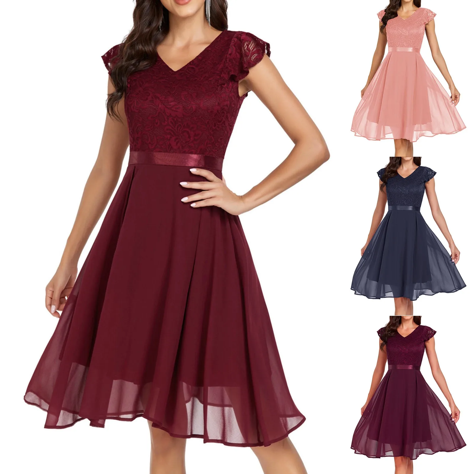 V Neck Lace Chiffon Evening Dress Elegant Formal