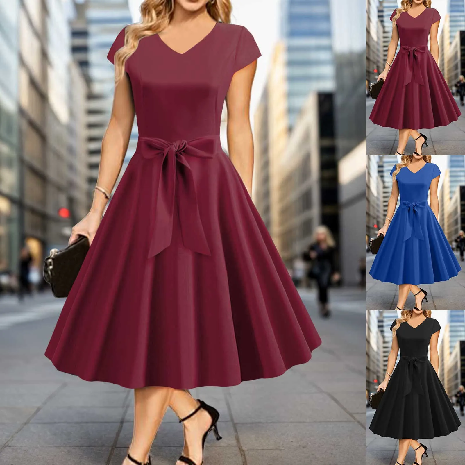 Vintage Bowknot Solid V Neck Short Sleeve Dress Elegant