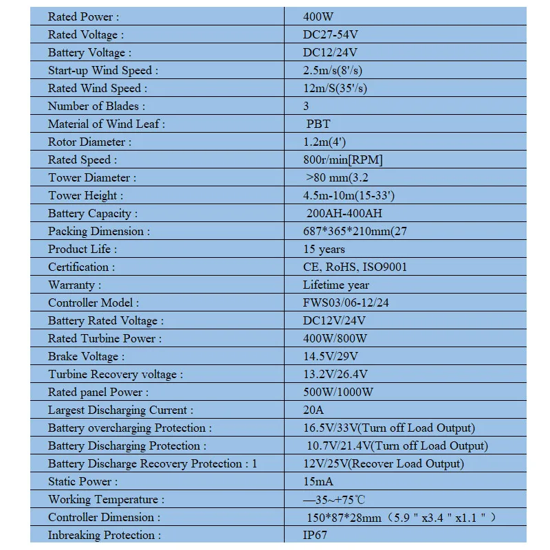 Rated Turbine Power: 400W/800W