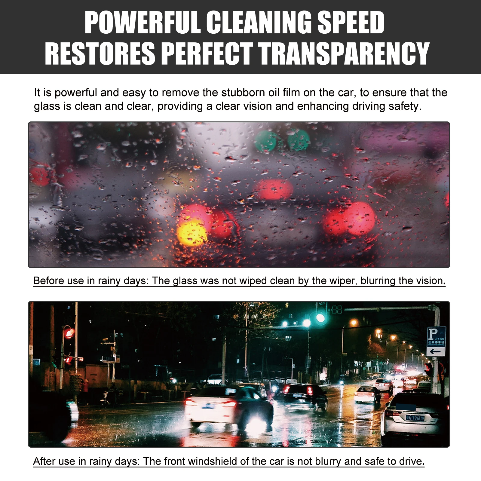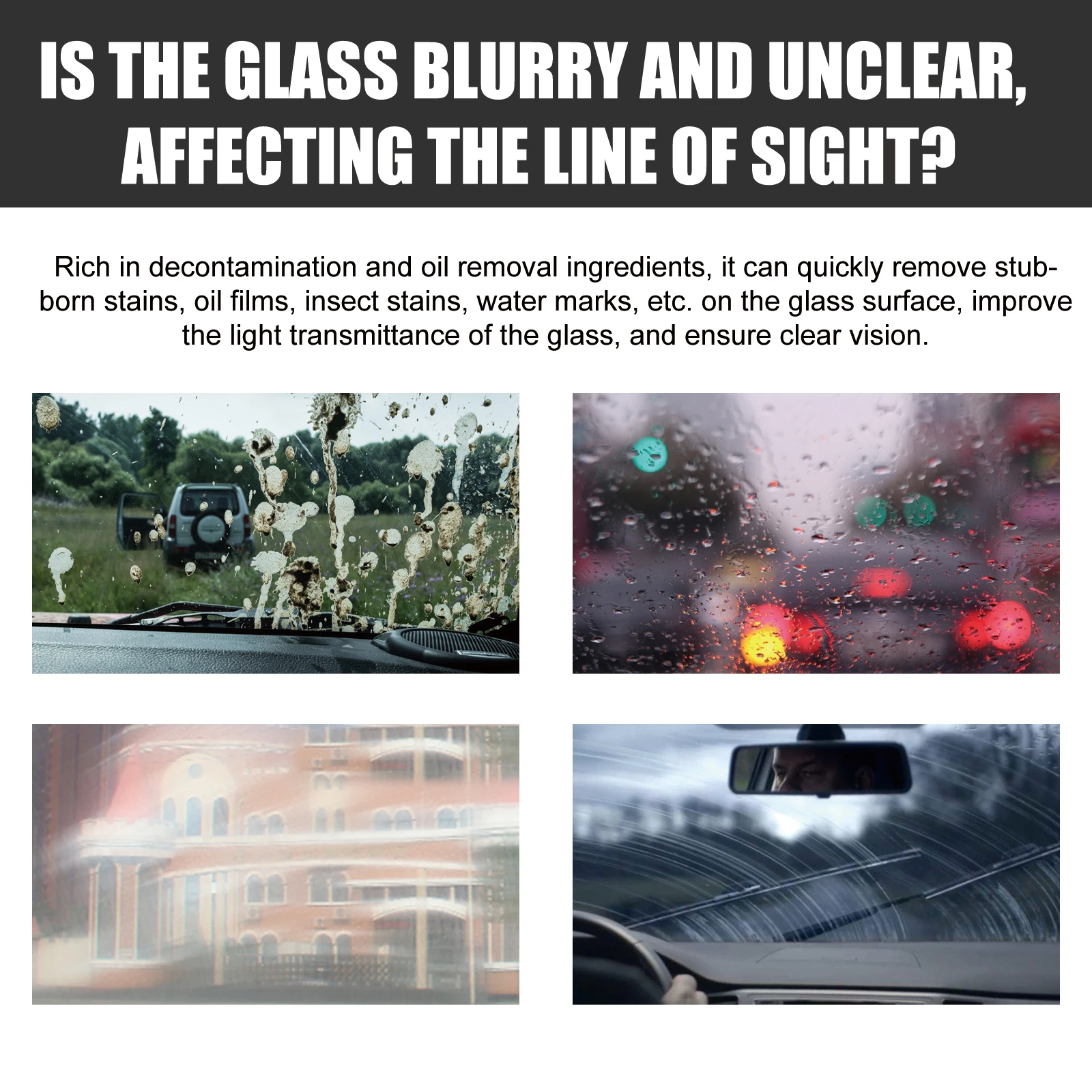 It can quickly clean the glass surface, remove stubborn stains in the car, do not damage the glass, decontamination traces, rich in decontamination and oil removal ingredients, can quickly remove stubborn stains on the glass surface, oil film, insect stains, water stains, etc., improve the glass transmittance, ensure clear vision.