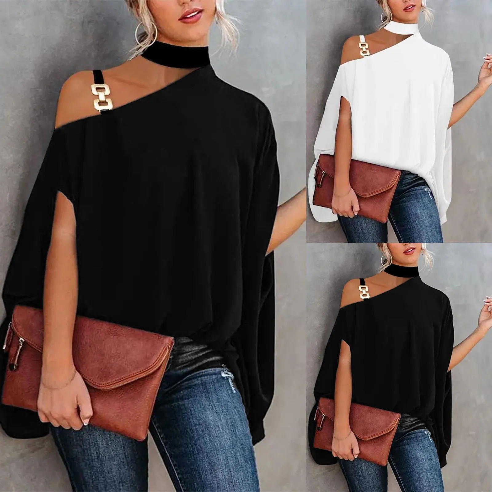 Women Casual Solid Shirt Blouse Strap Cold Shoulder