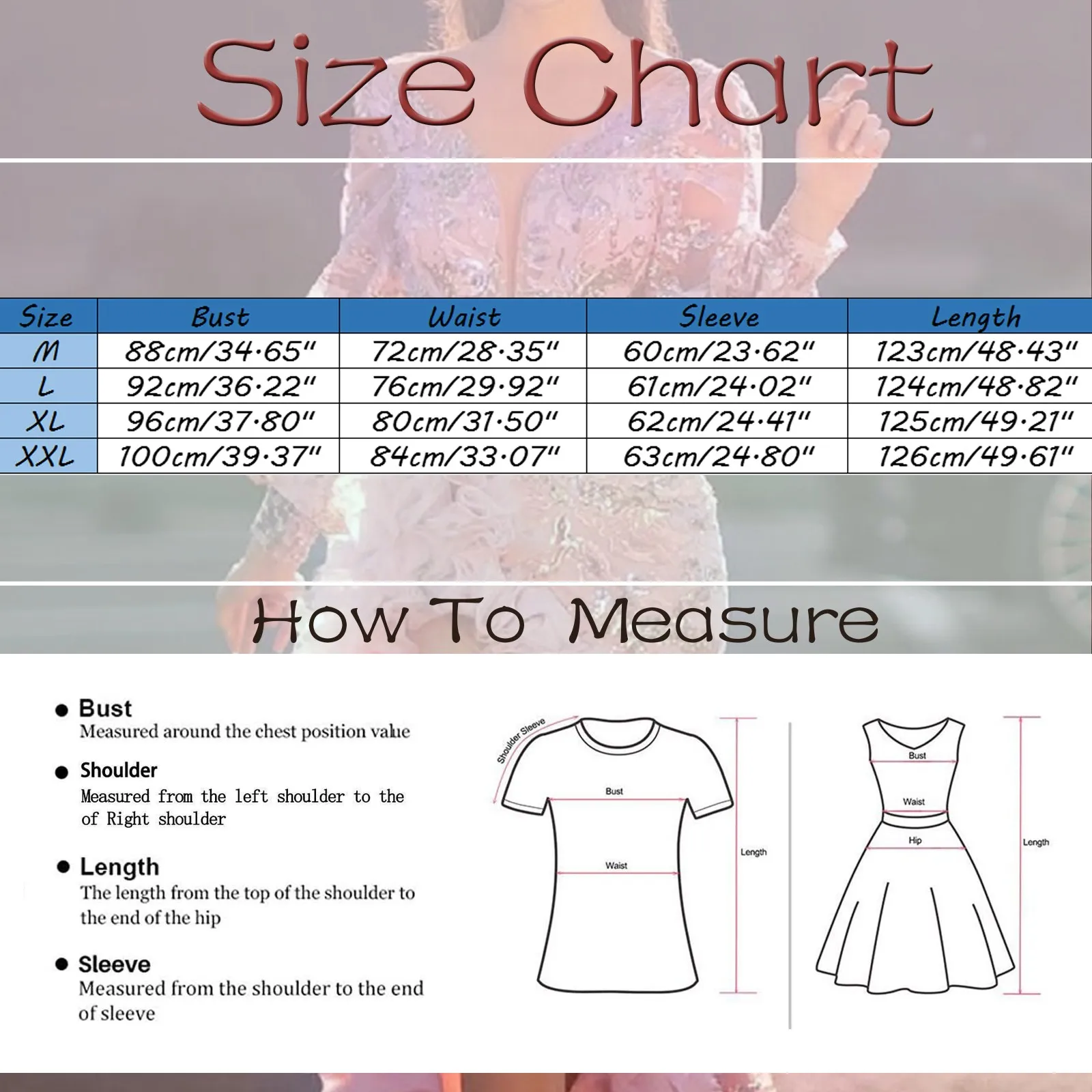 | Size | Bust | Waist | Sleeve | Length |