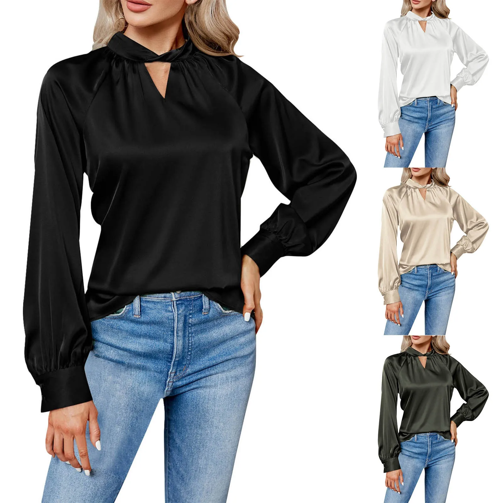 Women'S Satin Blouse Puff Long Sleeve Silk Shirts