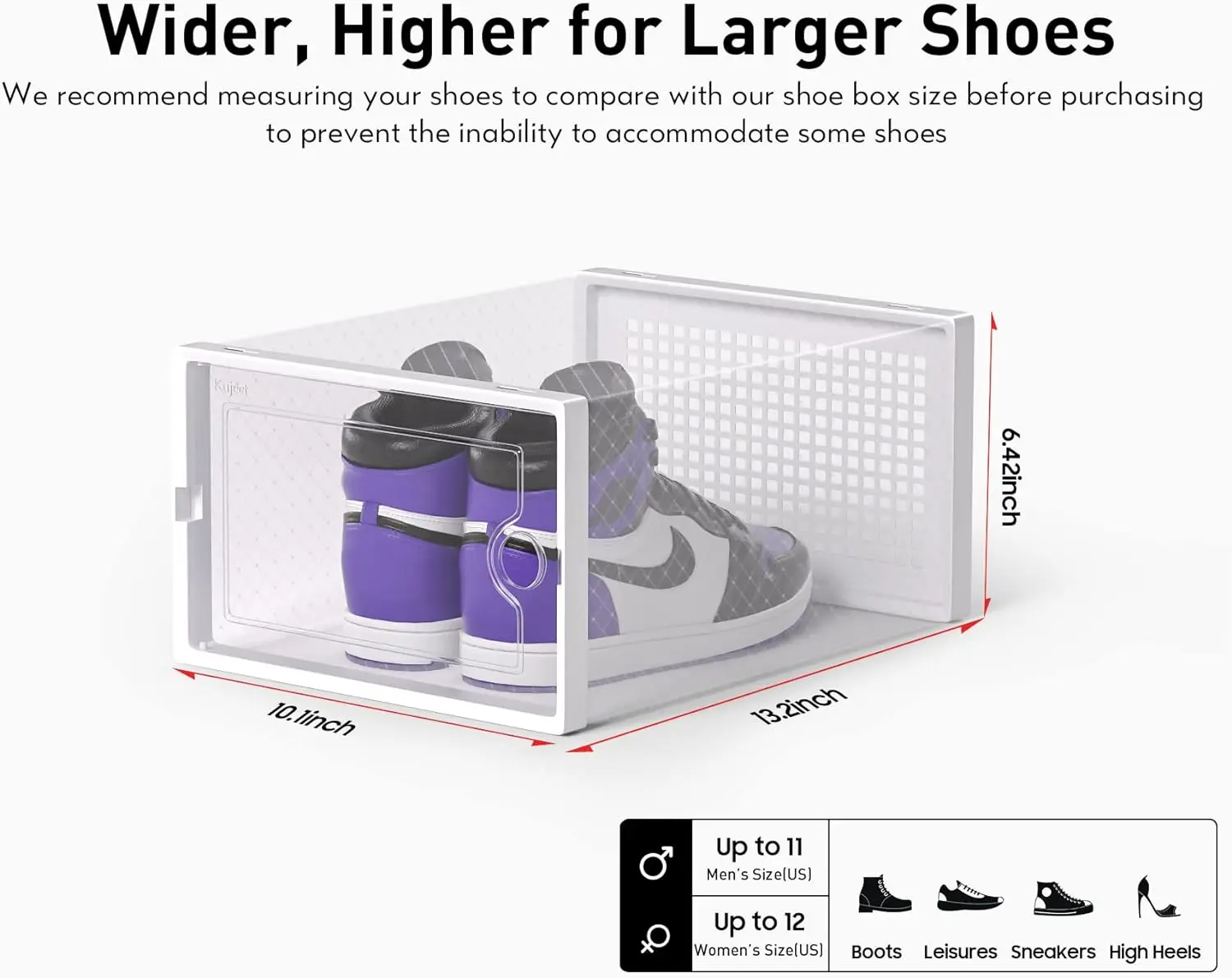 - Extra Large Storage Size for Various Type of Shoes: 13.2"L*10.1"W*6.42"H, the upgraded large shoe boxes are wider and higher. It fits women's shoes up to size 12(US) and men's shoes up to size 11(US), which is suitable for many types of shoes such as boots, leisure, sneakers and high heels.